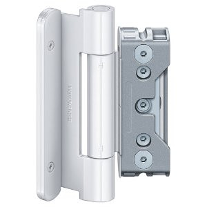 SIMONSWERK Holzhaustürband BAKA Protect 4010 3D FD mit verdeckt liegendem Aufnahmeelement im Flügel und Rahmen für Türen mit Flügeldichtung. CE-zertifiziert, Belastungswert 160 kg, Komfort-Exzenter-Verstellung, Rollenlänge 140 mm, Rollendurchmesser 20 mm, DIN rechts und links verwendbar. Dreidimensional verstellbar: Höhe +/-3,0 mm, Seite +/-3,0 mm, Andruck +/-3,0 mm. Wartungsfreie Gleitlagertechnik. Dies ist ein viertes Zusatzband zu den BAK007-() Garnituren. Oberfläche RAL9016 Verkehrsweiß