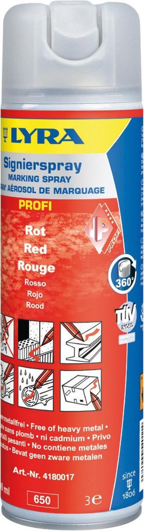 Signierspray, extrem schnell trocknend, extrem hohe Deckkraft und Lichtbeständigkeit, beste Ergiebigkeit, vollständig entleerbar, echte 360°-Anwendung, TÜV-zertifiziert, frei von Xylol und Toluol.