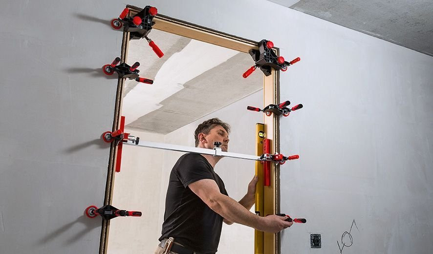 - Fixiert und stützt Türfutter beim Ausschäumen der Mauerfuge schonend und exakt