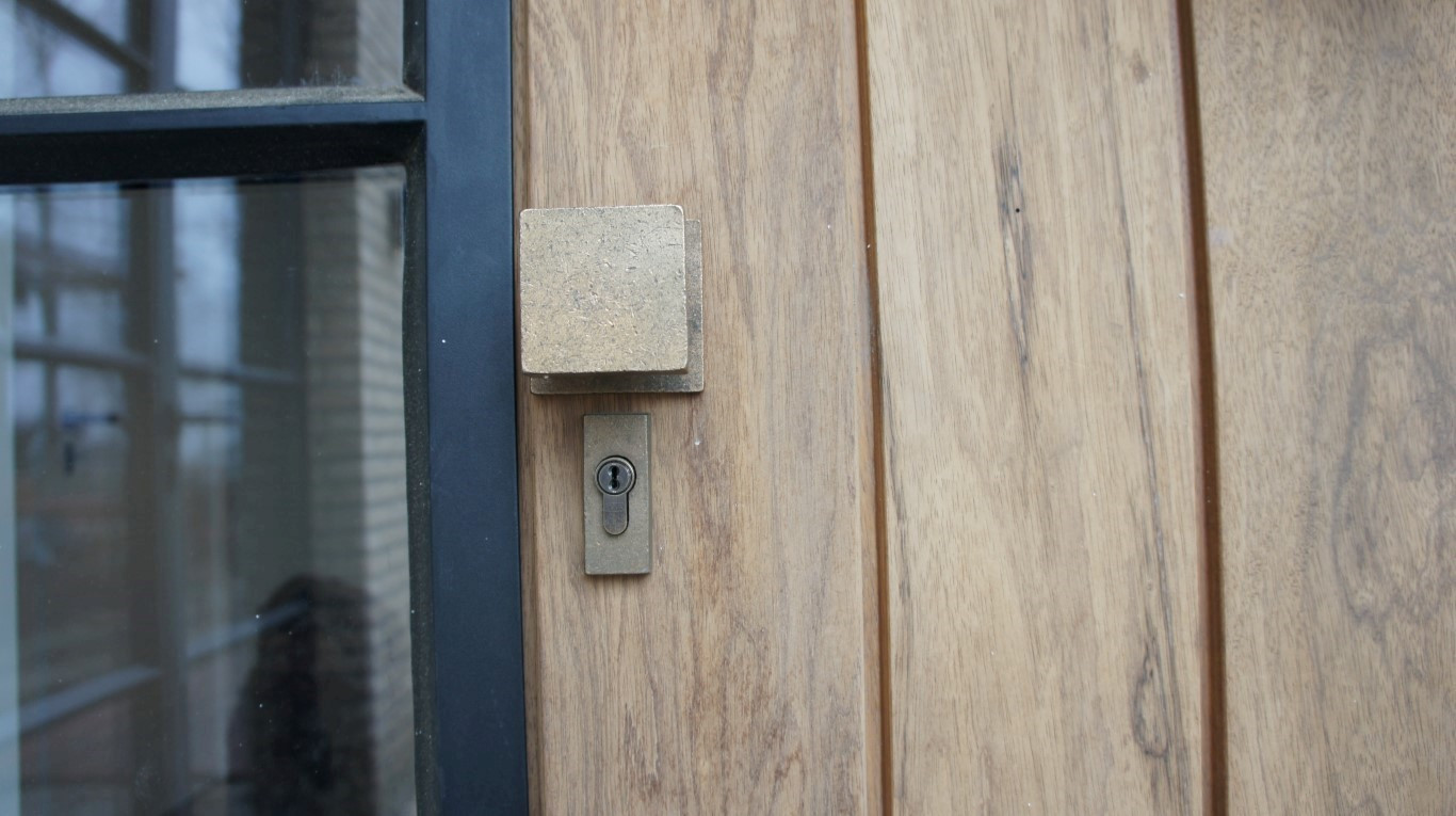 Nicht jeder feste Haustürgriff muss rund sein. Eine strenge Wohnungstür soll auch so bleiben und bekommt einen passenden ästhetischen Akzent mit diesem Griff. Dieser viereckige Griff wird mit einer viereckigen Sicherheitsrosette komplettiert.