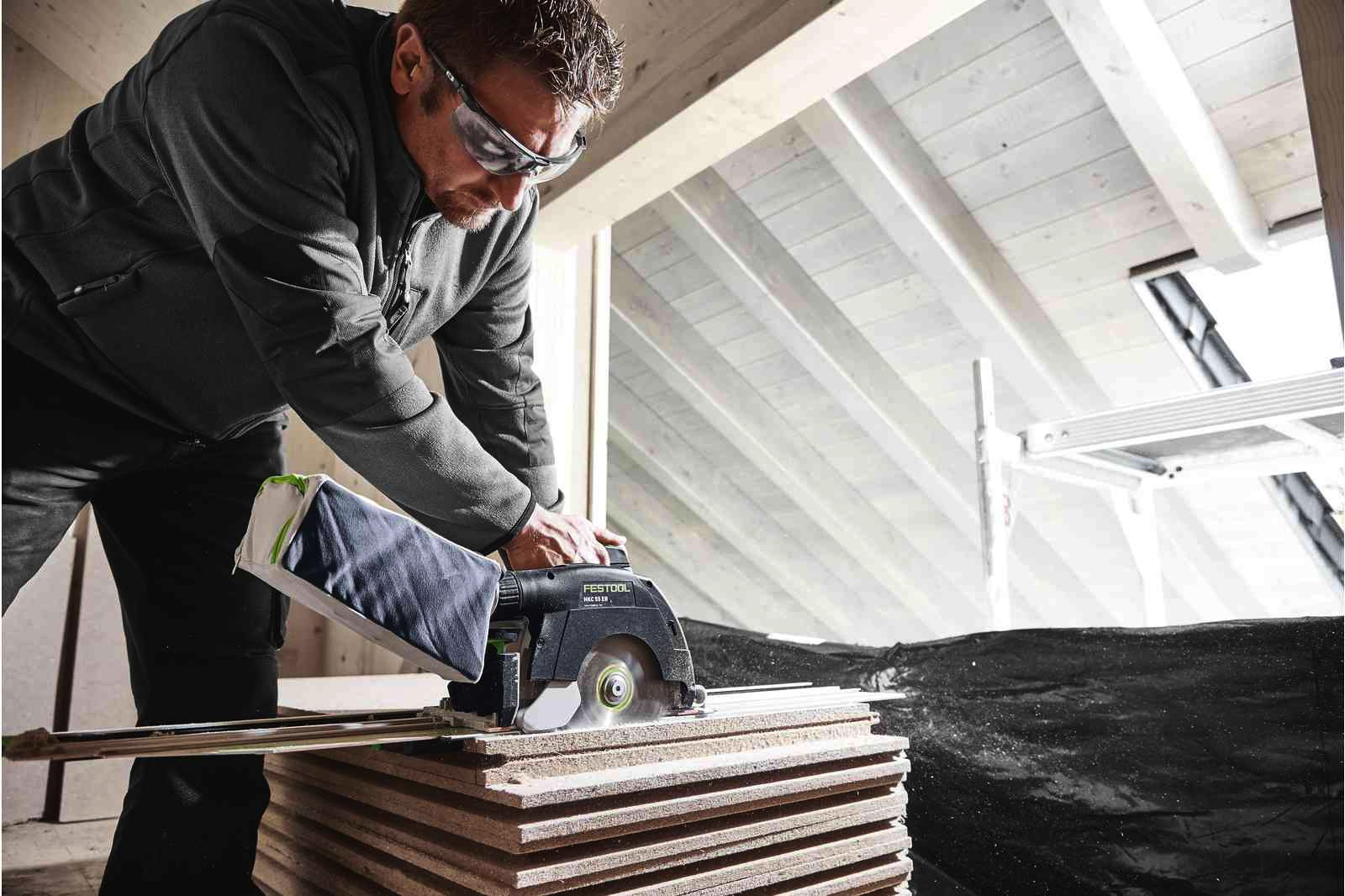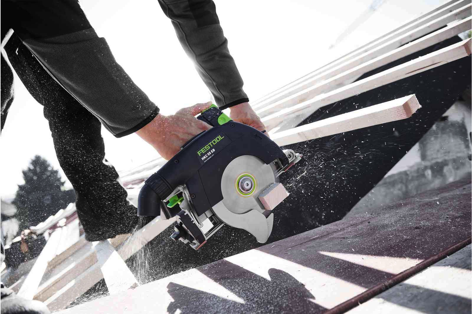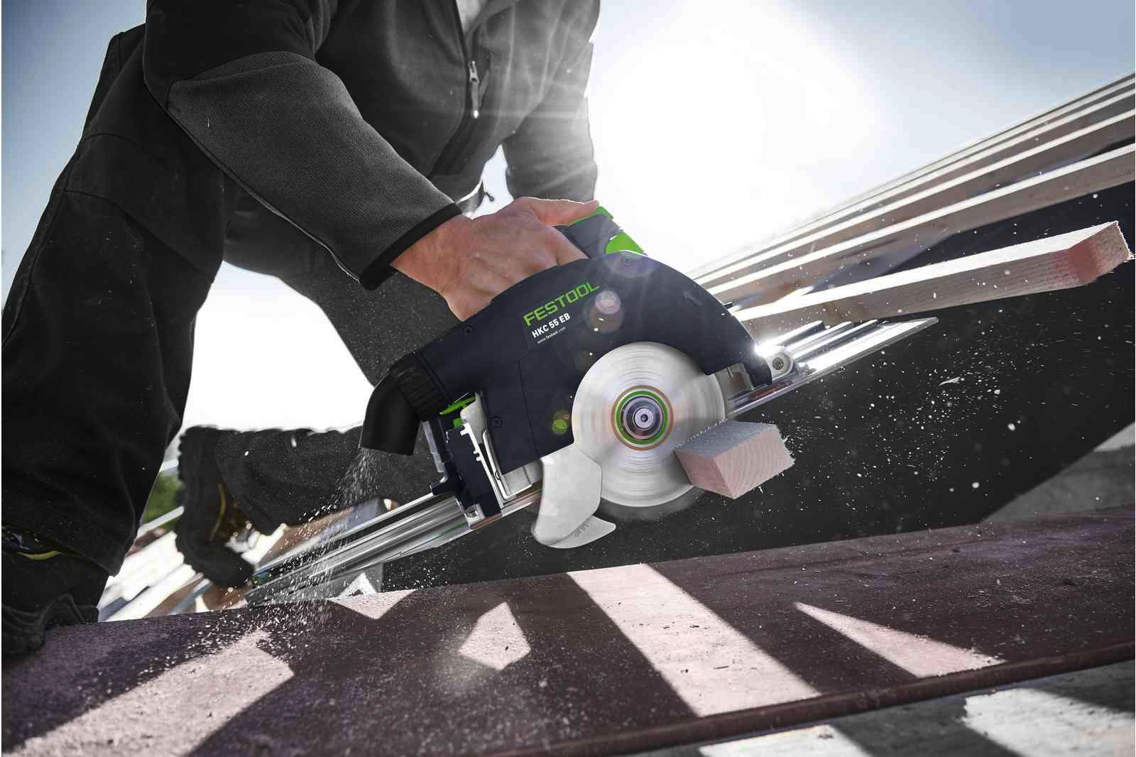 Ob auf dem Dach oder auf festem Boden, ob wiederholgenaue Winkelschnitte und geführte Schnitte in Kombination mit den Kappschienen FSK und den Führungsschienen FS oder präzise Gehrungsschnitte – die Akku-Handkreissäge HKC 55 zeigt, was moderne Handkreissägen heute leisten können. Und sie beweist es bei jedem Schnitt. Durch ihre Vielseitigkeit, flexible Einsetzbarkeit und maximale Präzision. Jeden Tag neu.