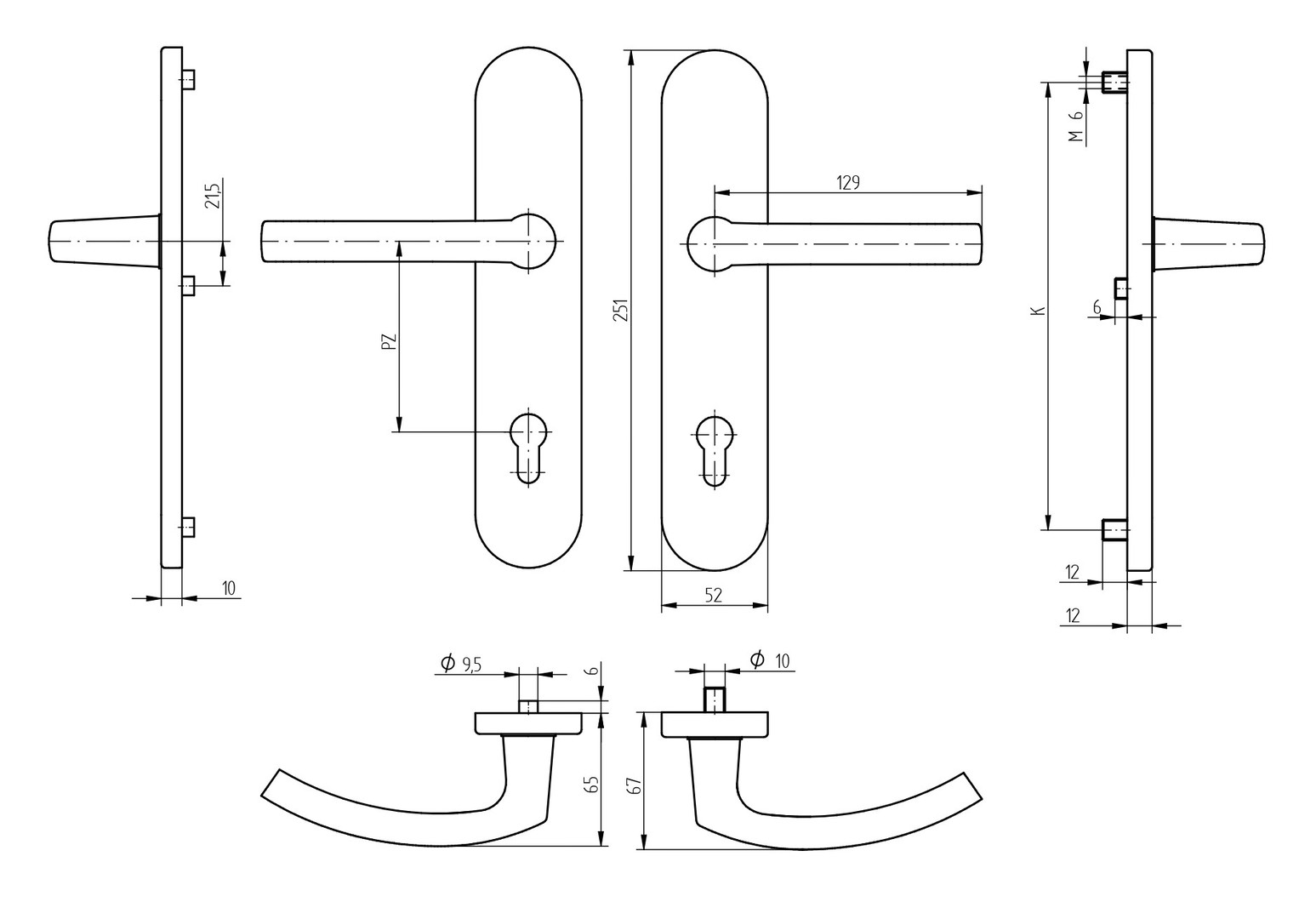 Schutzgarnitur bestehend aus Griff 2200, Außenschild mit Stahlgewinde M6 und gehärteter Stahlunterkonstruktion, Innenschild mit Rückholfeder, beide Schilder abgedeckt mit ovalen Kappen, Verschraubung mit hochfesten Schrauben M6, 8mm Vierkant