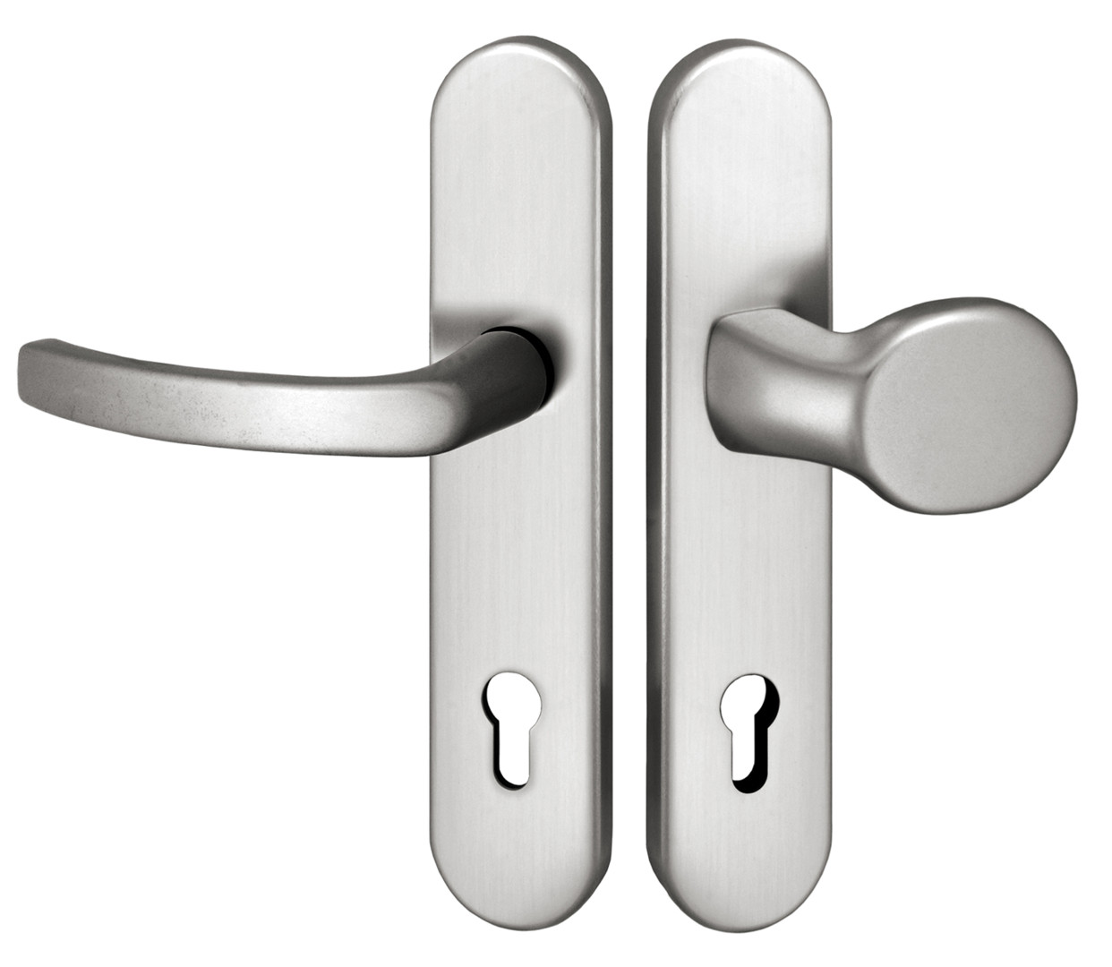 Schutzgarnitur bestehend aus Griff 2200 und festem Knopf Typ G1, Außenschild mit Stahlgewinde M6 und gehärteter Stahlunterkonstruktion, Innenschild mit Rückholfeder, beide Schilder abgedeckt mit ovalen Kappen, Verschraubung mit hochfesten Schrauben M6, 8mm Vierkant