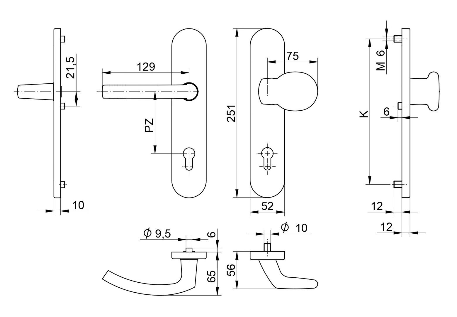 Schutzgarnitur bestehend aus Griff 2200 und festem Knopf Typ G1, Außenschild mit Stahlgewinde M6 und gehärteter Stahlunterkonstruktion, Innenschild mit Rückholfeder, beide Schilder abgedeckt mit ovalen Kappen, Verschraubung mit hochfesten Schrauben M6, 8mm Vierkant