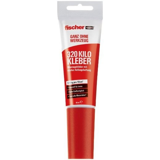 Pure Kraft. Der fischer 320 Kilo Kleber ist genau richtig, wenn etwas extrem viel und dauerhaft halten muss. Selbst das Verkleben von Garderoben - an die schwere Jacken gehängt werden - ist damit kein Problem. Befestigen ohne zu bohren und trotzdem eine hohe Performance erbringen: Eine Aufgabe, die der 320 Kilo Kleber von fischer löst. Der flexible Einsatz des 320 Kilo Kleber befestigt Steine, Regale, Schlüsselbretter und Sockelleisten. Mit der Fugenspitze der Tube lässt sich der Klebstoff präzise aufbringen.