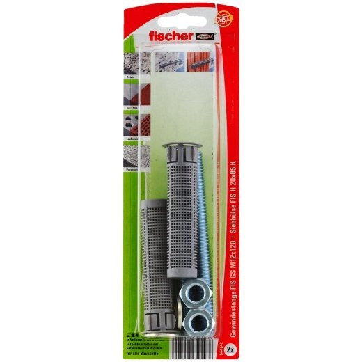 Der fischer Injektions-Gewindeanker FIS GS wird aus galvanisch verzinktem Stahl der Stahlgüte 5.8 hergestellt. Der Gewindeanker sowie die Siebhülse FIS H K sind Systemzubehör für das fischer Injektionssystem FIS. Bei der Montage in Vollbaustoffen mit den Injektionsmörteln wird die Ankerstange von Hand unter leichten Drehbewegungen in das Bohrloch geschoben. Für die Anwendung in Lochstein-Mauerwerk wird zunächst die Ankerhülse FIS H K in das Bohrloch gesteckt, sodass der Mörtel beim Setzen der Ankerstange durch die Gitterstruktur gedrückt wird und sich im Formschluss mit dem Lochstein verbindet.