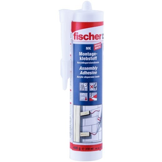 Der fischer Montageklebstoff MK-310 ist eine Ein-Komponenten-Acrylatdispersion. Mit extrem hoher Anfangsklebkraft zum Verkleben von Bauteilen, wobei mindestens eines der zu verklebenden Bauteile saugend sein muss. Der fischer MK-310 kann bei Temperaturen von +5 °C bis +35 °C verarbeitet werden und hat eine Verarbeitungszeit von 15 Minuten, zudem ist der MK-310 von -20 °C bis +70 °C temperaturbeständig.