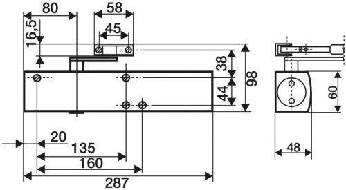Obenliegender Zahntrieb-Türschließer, EN 1154 A, für Anschlagtüren bis 1400 mm Breite, für Rauch- und Feuerschutztüren (Montageplatte verwenden), für rechts- und linksangeschlagene Türen ohne Umstellung, einstellbare Schließkraft im Größenbereich 1-6, optische Größenanzeige, regulierbare Öffnungsdämpfung, regulierbare, thermostabilisierte Schließgeschwindigkeit, alle Funktionen von vorn einstellbar, Endschlageinstellung über Gestänge, Sicherheitsventil in Auf- und Zu-Richtung, geprüft und güteüberwacht nach EN 1154 A, DIN links und DIN rechts verwendbar.