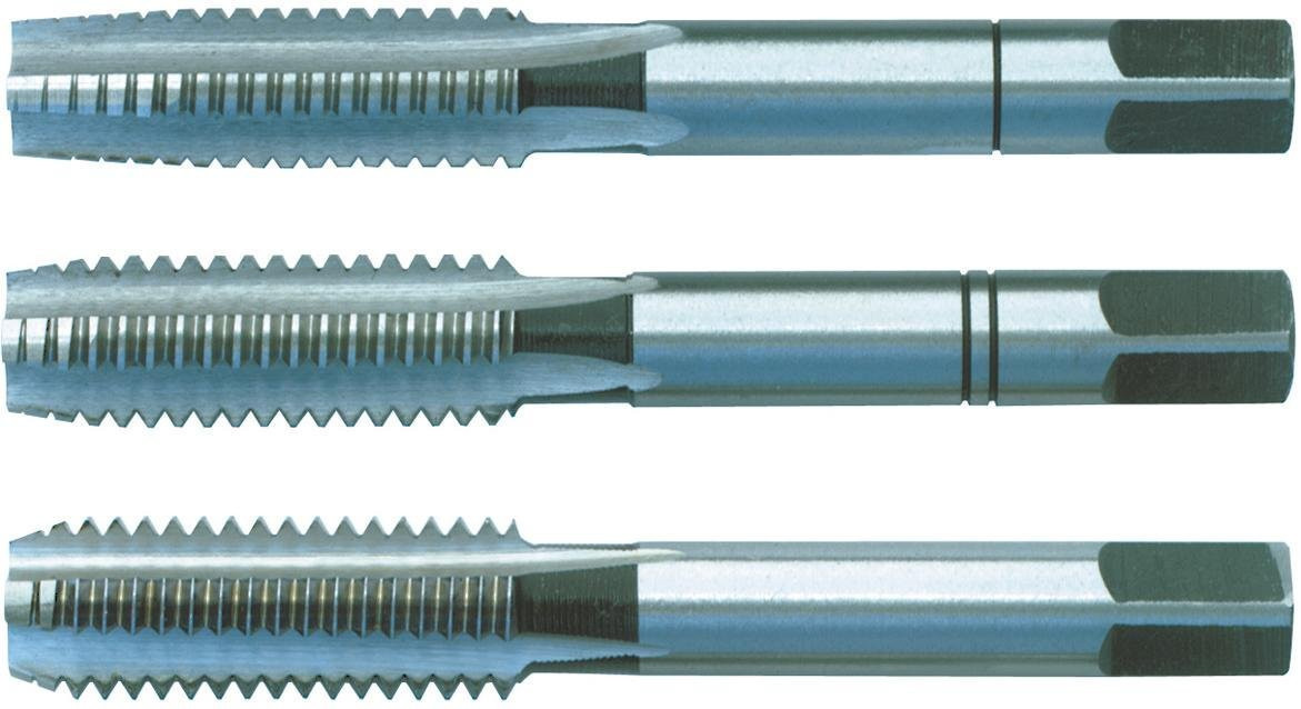 Präz.-Handgewindebohrer-Sätze HSS-G DIN 352, metrisches ISO-Gewinde DIN 13, geschliffenes Gewinde, Flanken hinterschliffen, 3-tlg.(Vor-, Mittel-, und Nachschneider) im Kunststoff-Kästchen.