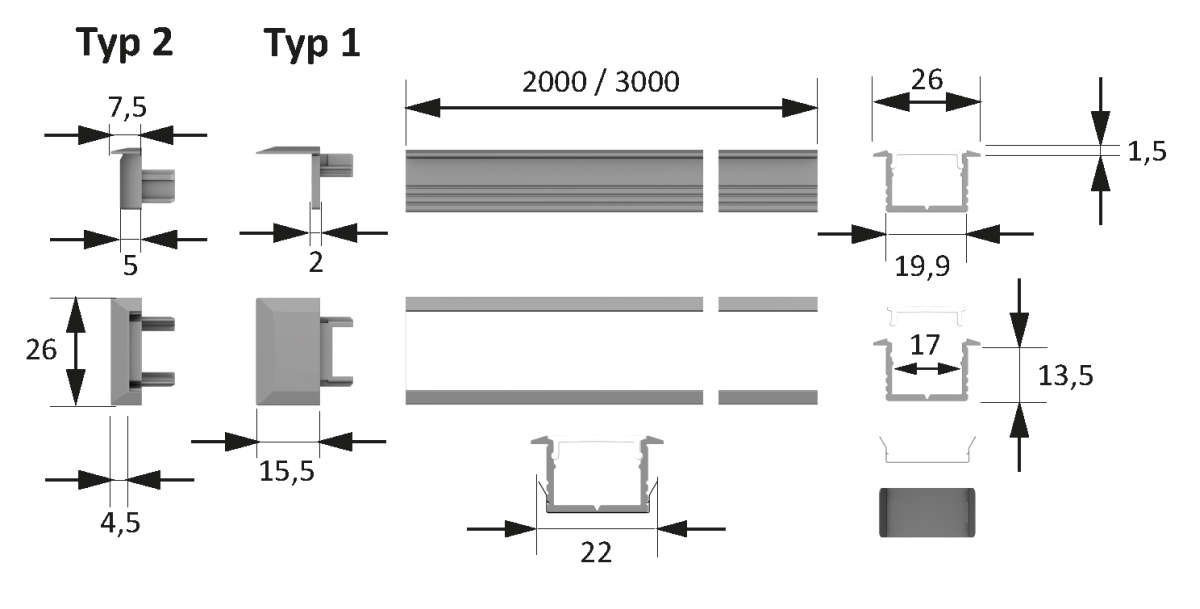 LED ChannelLine B Profil, opal L=3000, Alu-und Abdeckprofil