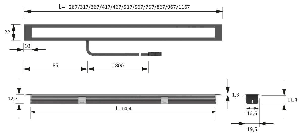 KitchenLine 867 mw² 12VDC 15,1W EDS Optik; Ltg. 1900mm, Zuführung b.85mm