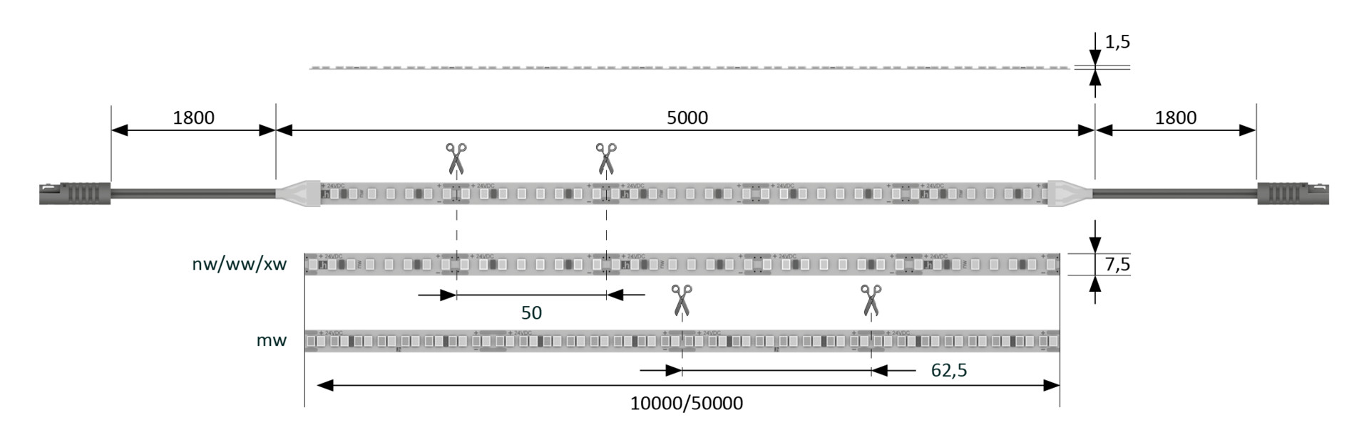 - Beidseitige Zuleitung bei der 5000 mm Länge (ein Schnitt, zwei Leuchten), siehe Zeichnung