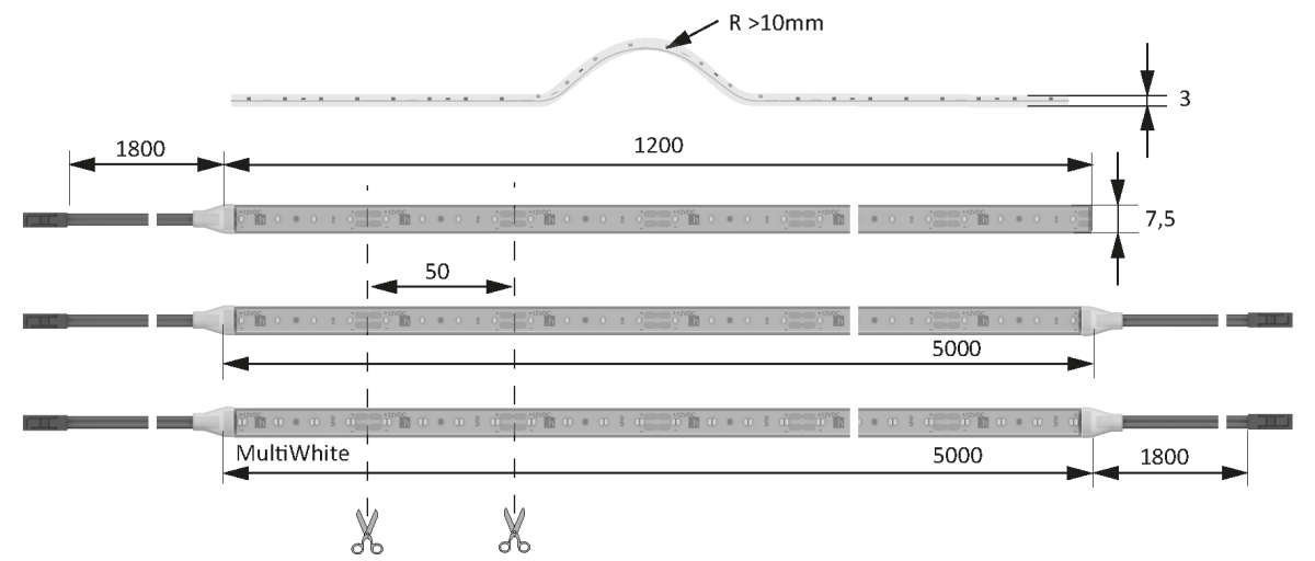 • Beidseitige Zuleitung bei der 5000 mm Länge(ein Schnitt, zwei Leuchten), siehe Zeichnung