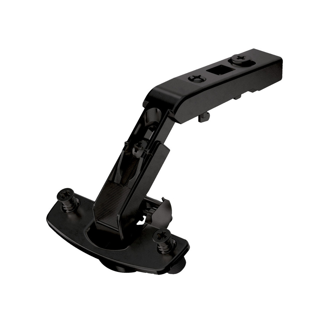 Hettich Scharnier für Eckschrankfalttüren ohne Schließautomatik (Intermat 9930), in obsidianschwarz, vorliegend, Öffnungswinkel 50° / 65°, TH-Bohrbild 52 x 5,5 mm, mit Spreizmuffen (ø 10 x 11)