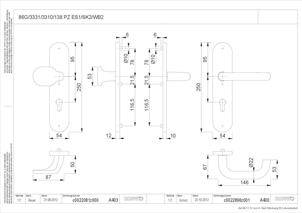 - Lagerung: außen gekröpfter Knopf fest, ummontierbar; innen Türgriff lose, Rückholfeder rechts/links verwendbar, wartungsfreies Gleitlager