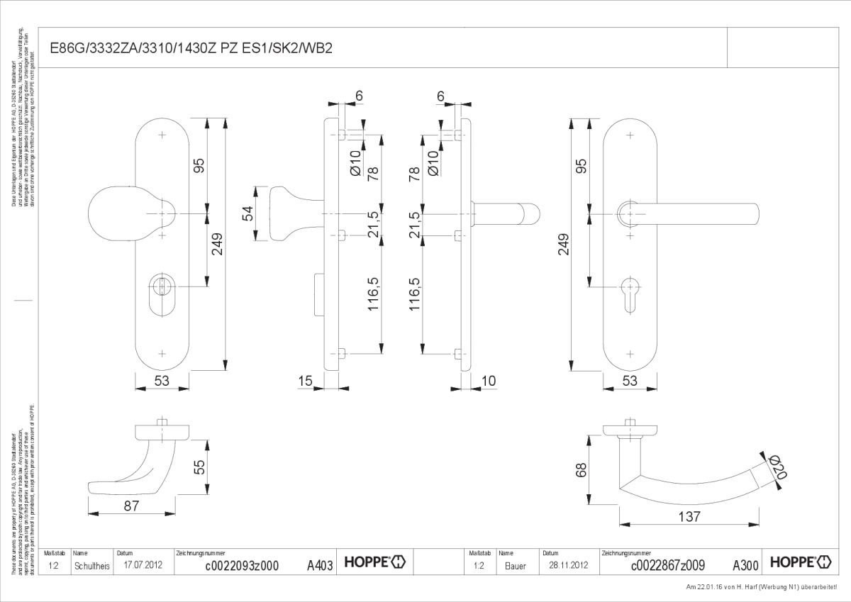 - Lagerung: außen gekröpfter Knopf fest, ummontierbar; innen Türgriff lose, Rückholfeder rechts/links verwendbar, wartungsfreies Gleitlager
