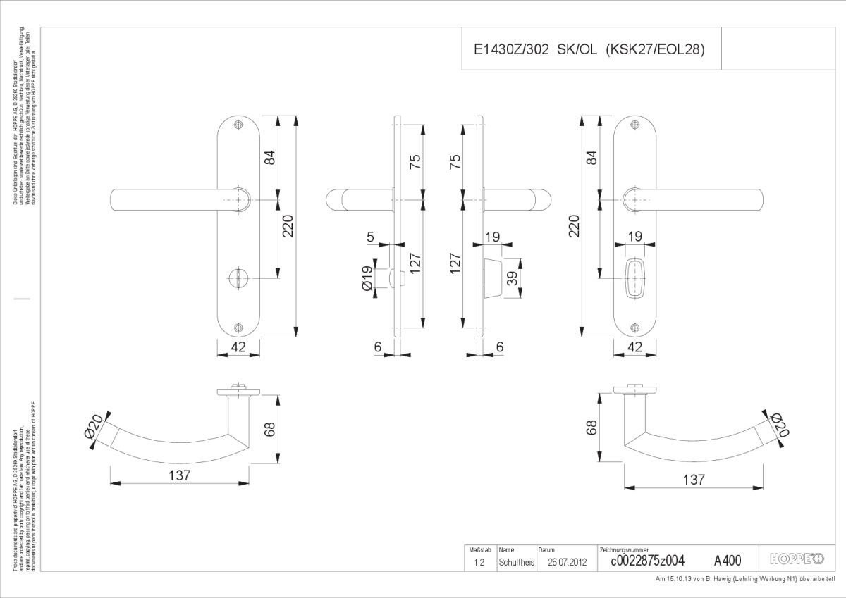 HOPPE-Edelstahl-Langschild-Türgriff-Garnitur mit Schlitzkopf/Olive für Bad/WC-Türen
