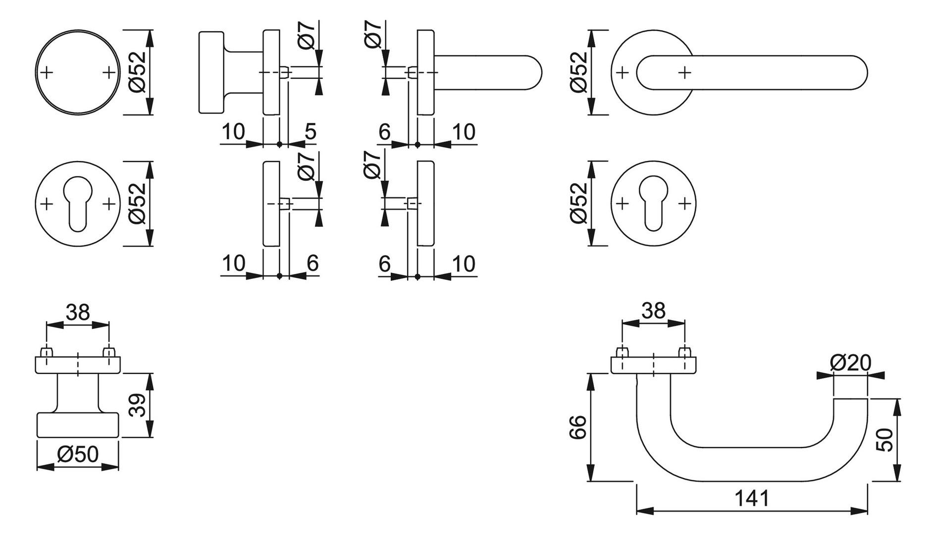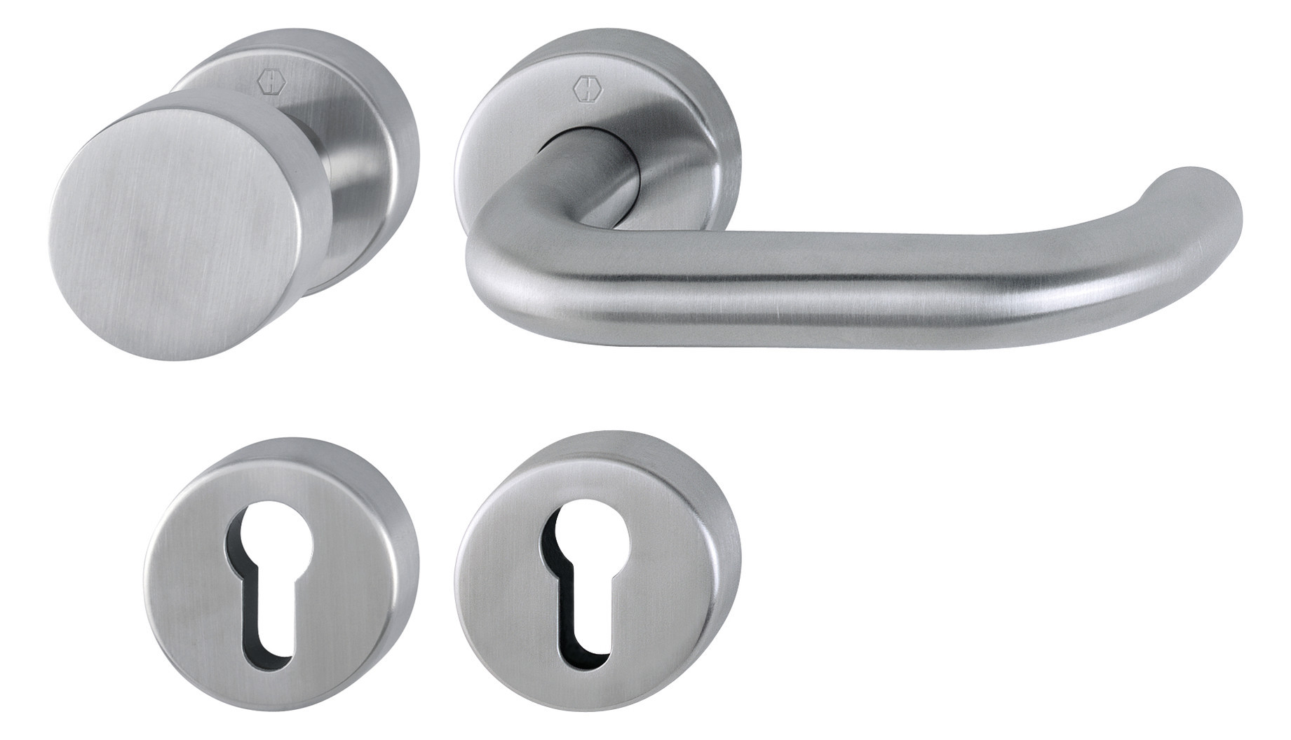 - Befestigung: verdeckt, durchgehend; Knopf-/Griffrosetten Gewindeschrauben M5; Schlüsselrosetten Mehrzweckschrauben, wechselseitig