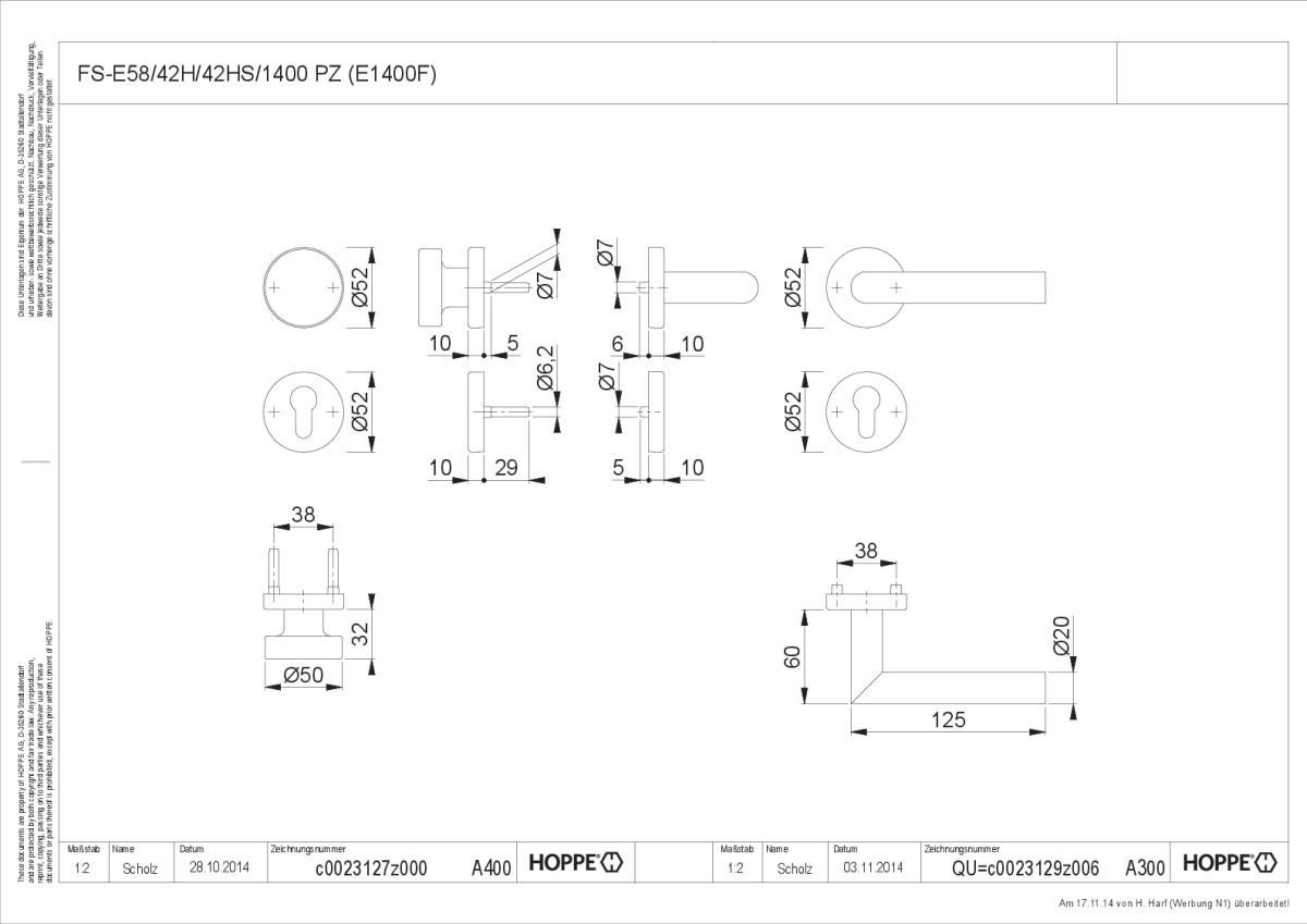 - Lagerung: außen Knopf fest; innen Türgriff fest/drehbar, Rückholfeder, HOPPE-Steckgriff-Verbindung mit Kugel-Arretierung Sertos ®, wartungsfreies Gleitlager