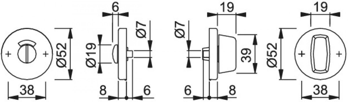 Rosetten-Ø 52 mm, Rosettenstärke 8 mm, Nockenabstand 38 mm, mit Befestigungsschrauben.