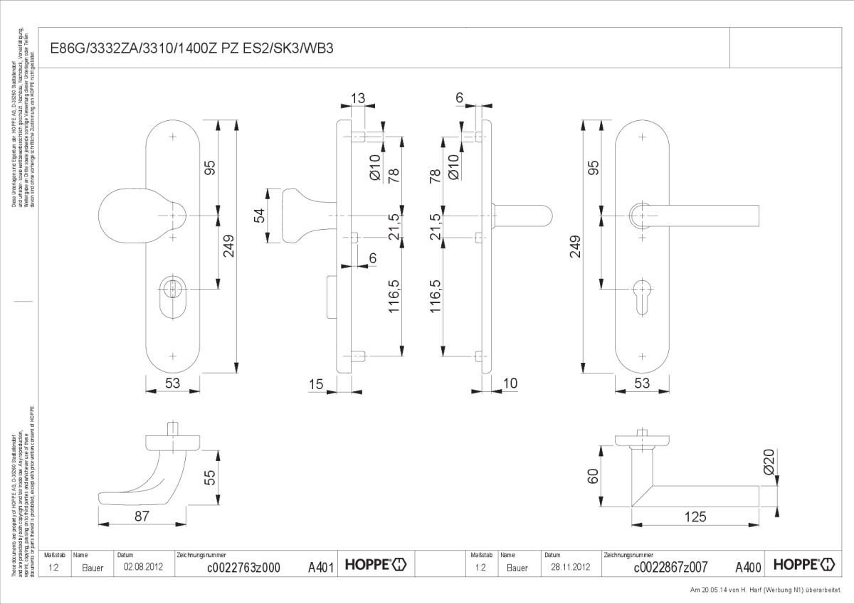 - Lagerung: außen gekröpfter Knopf fest, ummontierbar; innen Türgriff lose, Rückholfeder rechts/links verwendbar, wartungsfreies Gleitlager