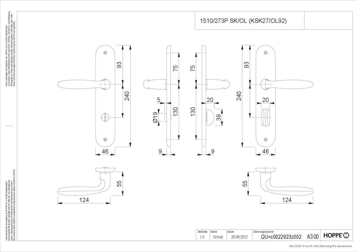 HOPPE-Aluminium-Langschild-Türgriff-Garnitur mit Schlitzkopf/Olive für Bad/WC-Türen