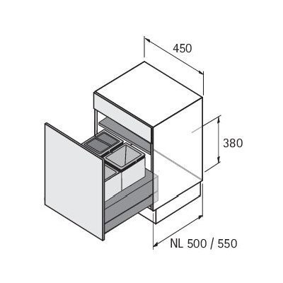 - Unten laufendes Abfallsystem für ArciTech Frontauszüge, Systemhöhe 186 mm, Zargenhöhe 94 mm, Nennlänge (NL) 500 mm