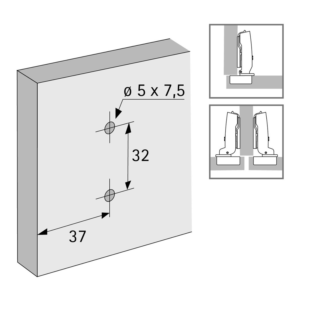 - Montage Hettich Direkt mit Pilotzapfen und Spezialschrauben (für Bohrung ø5 x 7,5 mm)