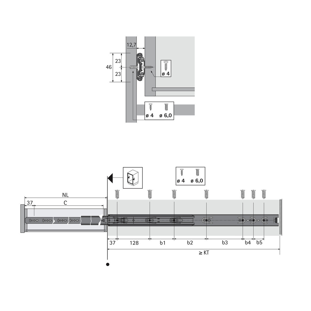 Hettich Kugelauszug KA 5632, Seitenmontage, Abmessungen (H x B) 46 x 12,7 mm, 400 mm, schwarz