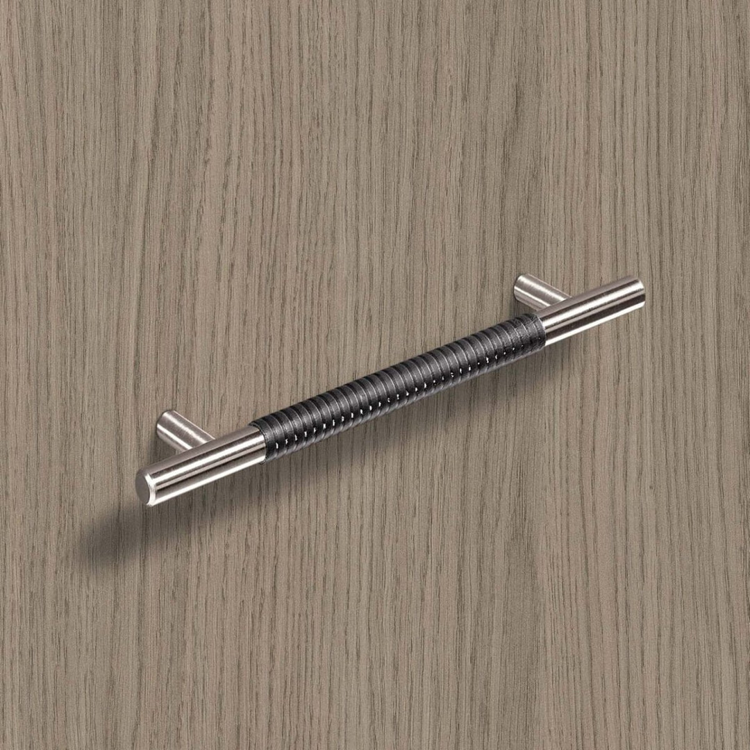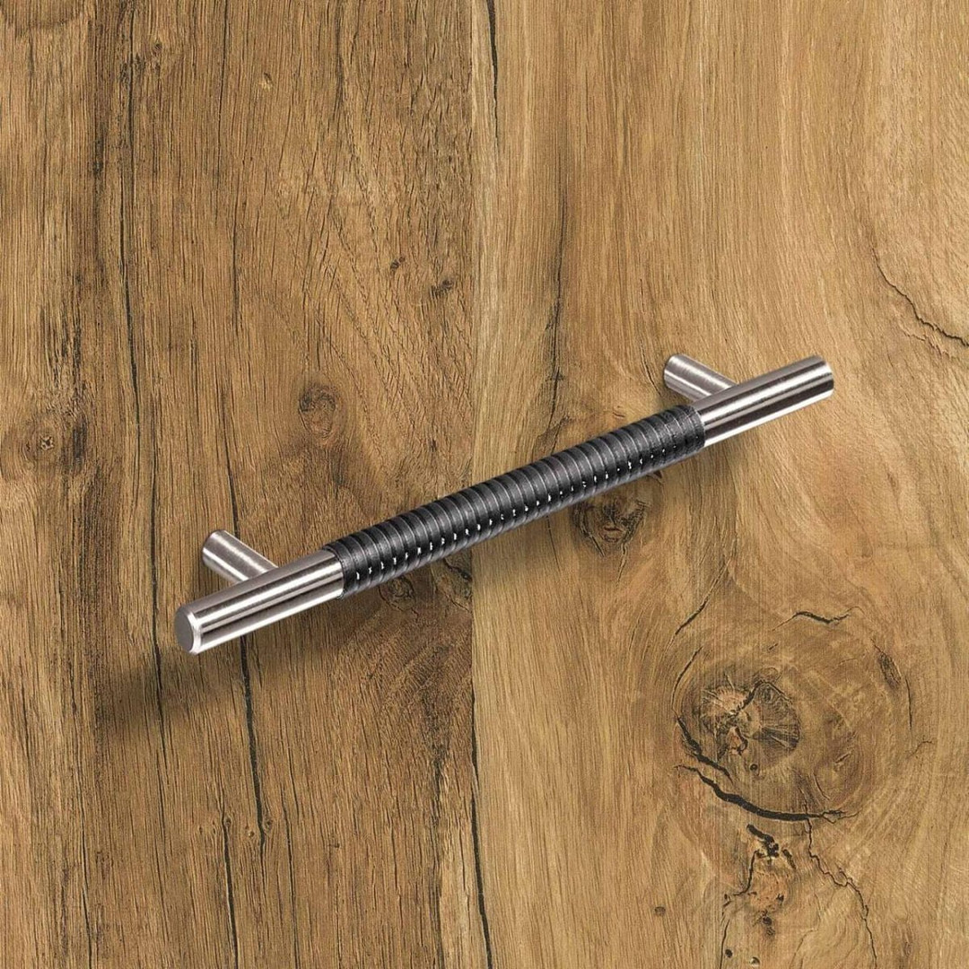 Hettich Möbelgriff "Byzantia" - Leder dunkelbraun gemustert / Edelstahl Optik gebürstet - BA 128mm