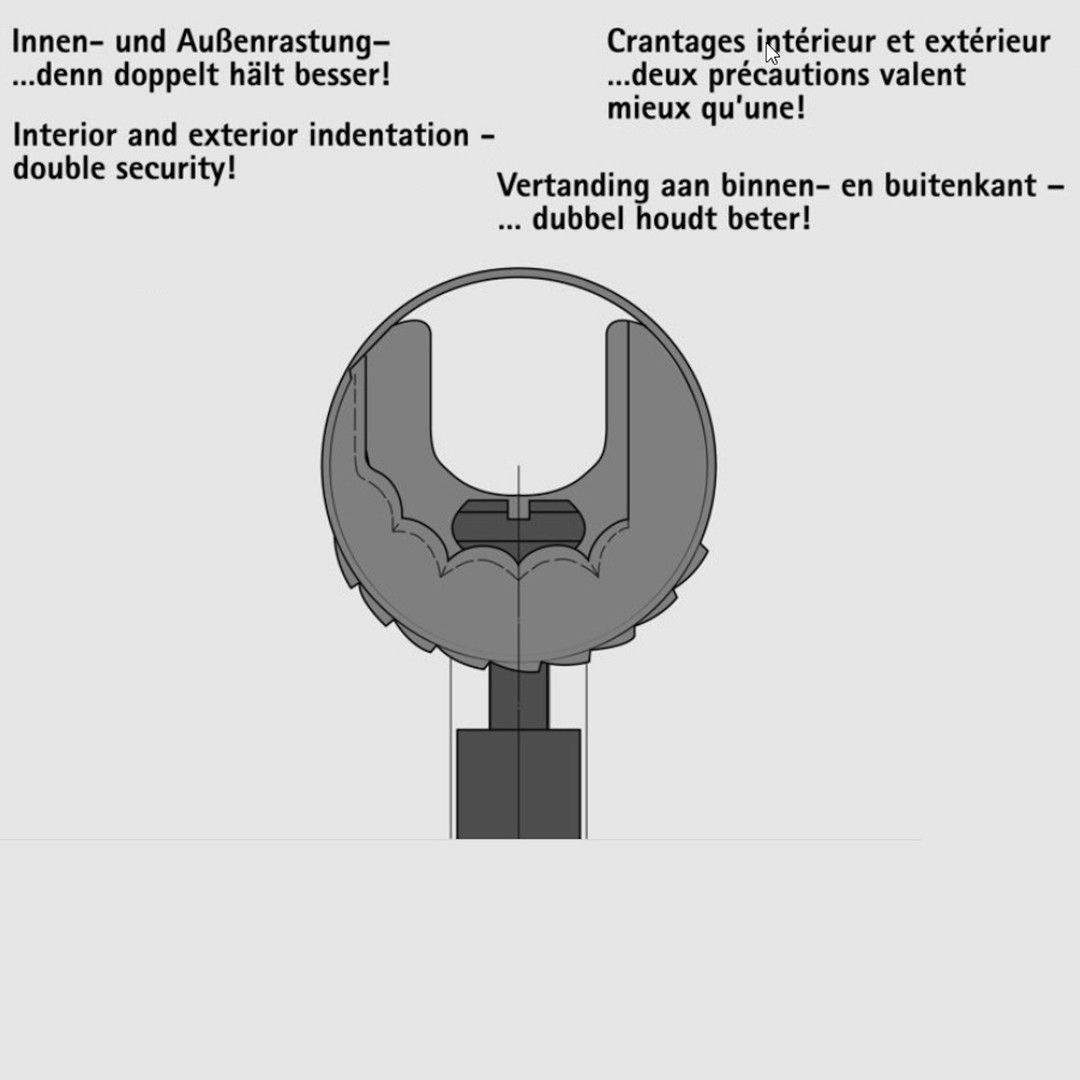 - Die Raststufen in der Spannkurve und die sägezahnartige Außenrastung verhindern ein selbstständiges Lösen des Exzenters