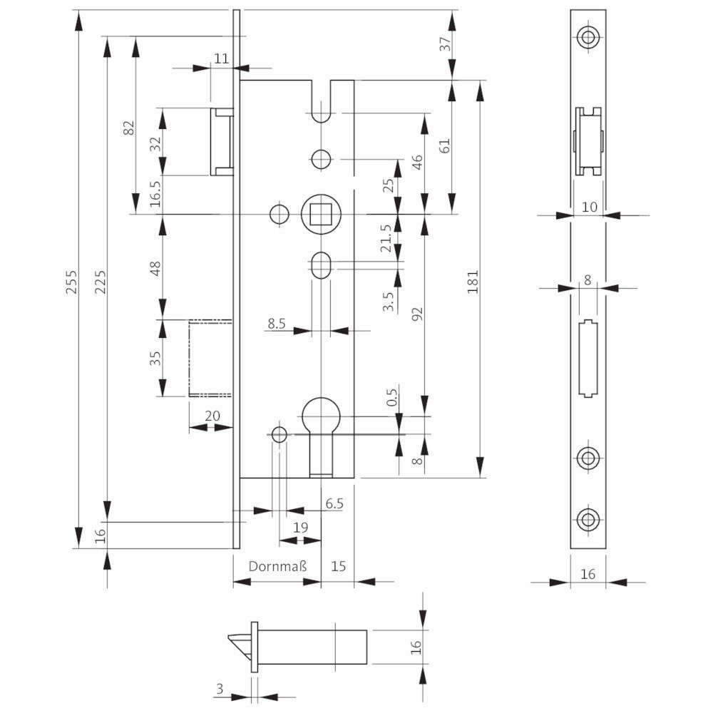 Objektschlösser für Rohrrahmensysteme. Möglichkeit zur durchgehenden Befestigung handelsüblicher Beschläge mit Ovalrosette, verzinkter Schlosskasten, Stulp käntig.