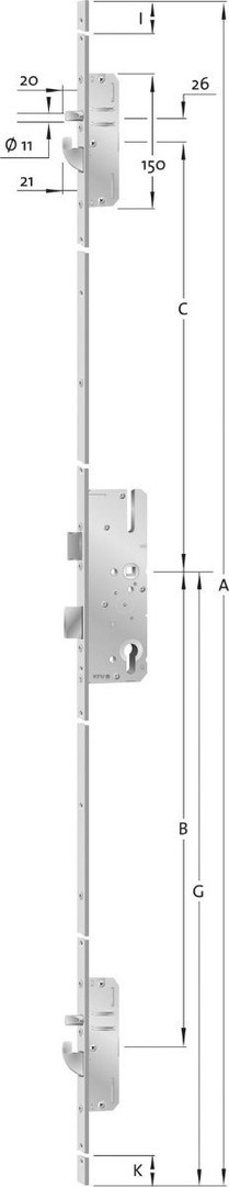 Mit kombinierter Rundbolzen-Schwenkriegel-Arretierung, Langstulp 2170 mm mit Hauptschloss und 2 Zusatzschlössern, Hauptschloss vorgerichtet für PZ, Entfernung 92 mm, 10 mm Nuss, DIN links und rechts umstellbar. Stulp hell verzinkt.