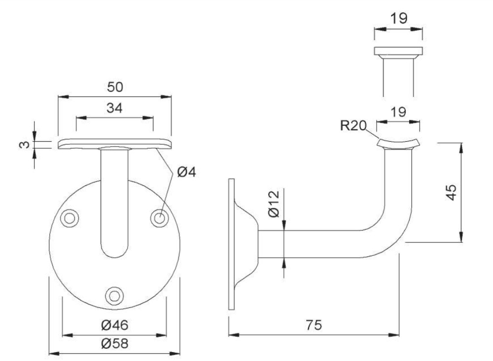 KWS Handlaufstütze z. Anschrauben 4524.73 mit gewölbter Auflage und drei versenkten Schraublöchern. (schwarz matt)