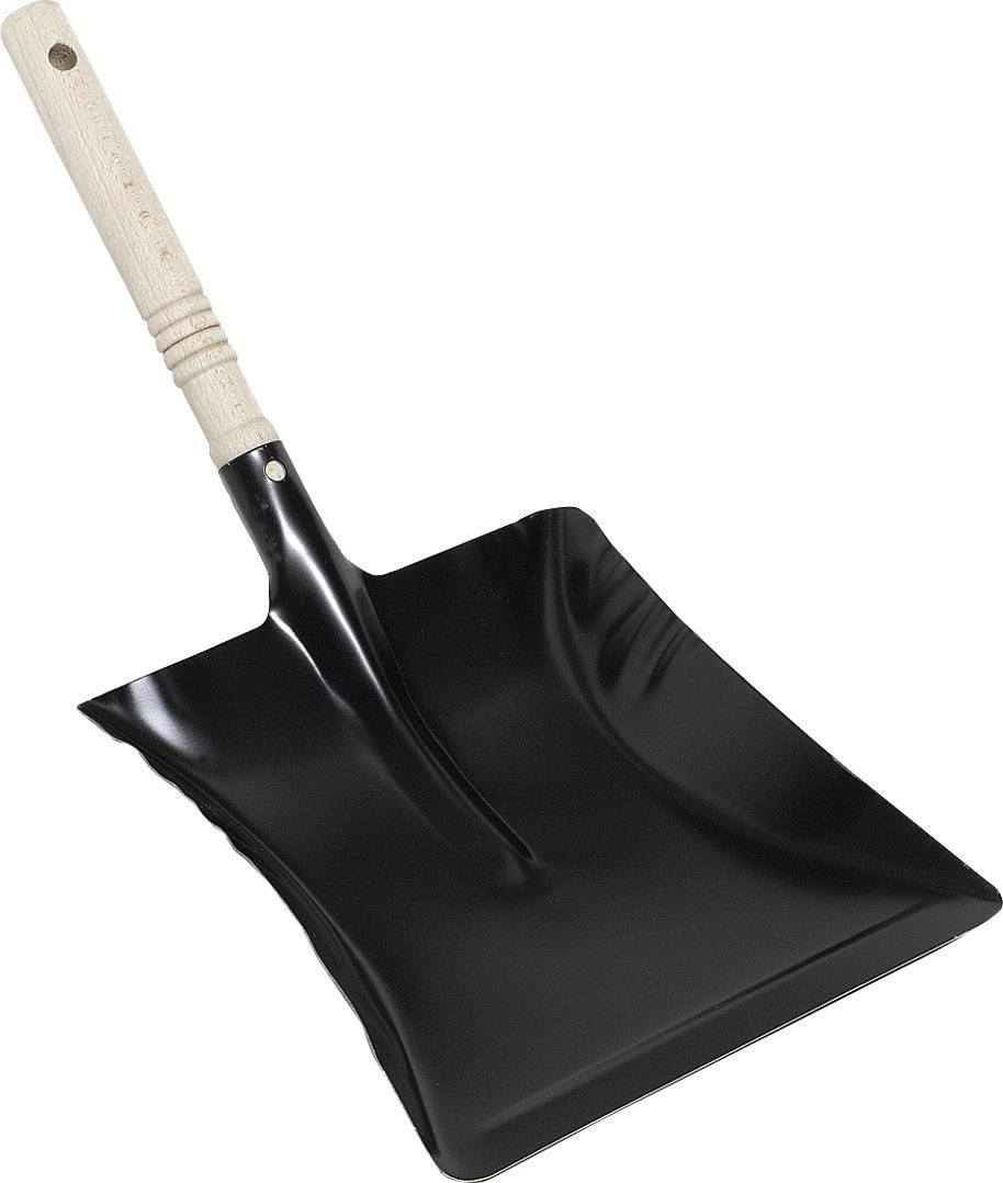 Kehrschaufel aus Metall, mit Holzgriff, schwarz lackiert.