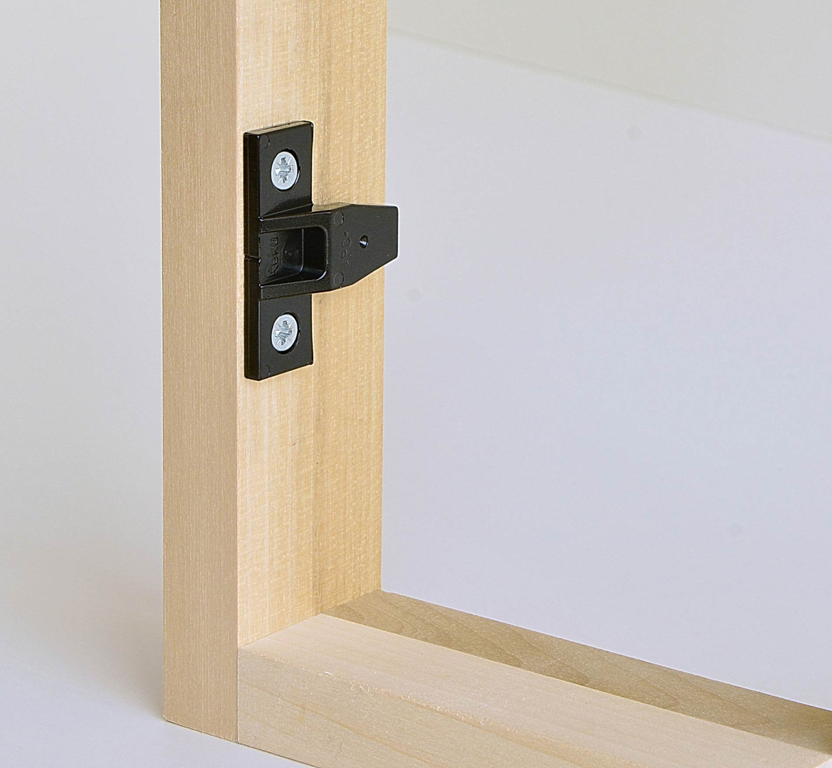 AS Beschläge bestehen aus dem Plattenteil AS und dem Rahmenteil AS bzw. aus der Kombination des Plattenteils AS mit dem Rahmenteil ASR. Beide Teile lassen sich mit Spanplattenschrauben 4 mm oder Euro-Schrauben 3 und 5 mm auf die Paneele bzw. die Rahmenkonstruktion anschrauben und können dann (reversibel) zusammengefügt werden. Ergänzend kann die Distanzplatte AS eingesetzt werden, um die Flächenbündigkeit zu angrenzenden Türfronten herzustellen. Sie ist stapelbar und selbstfixierend.