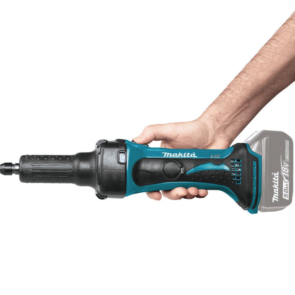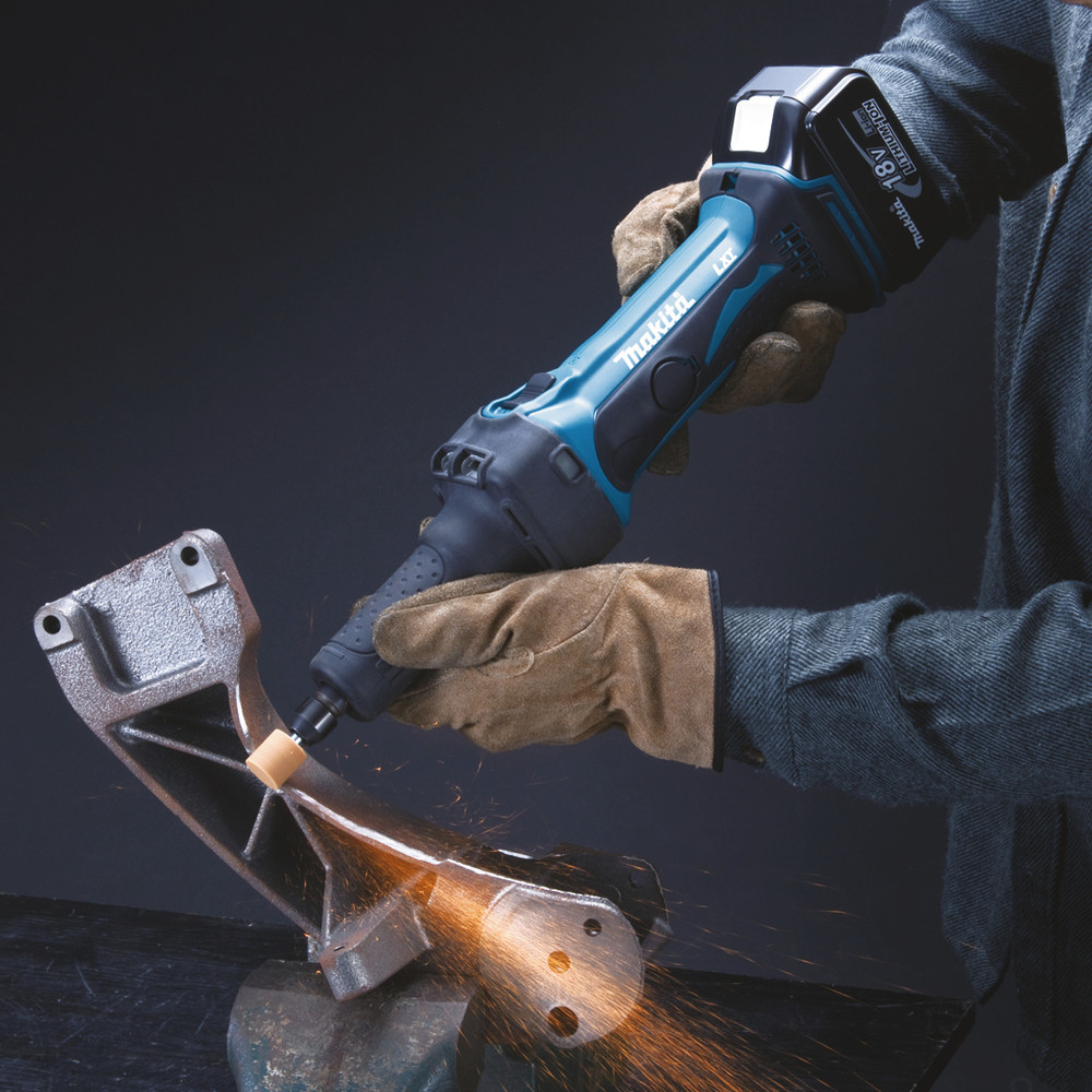 Leichter Akku-Geradschleifer mit einer langen Schleifspindel für optimale Handlichkeit. Der abnehmbare