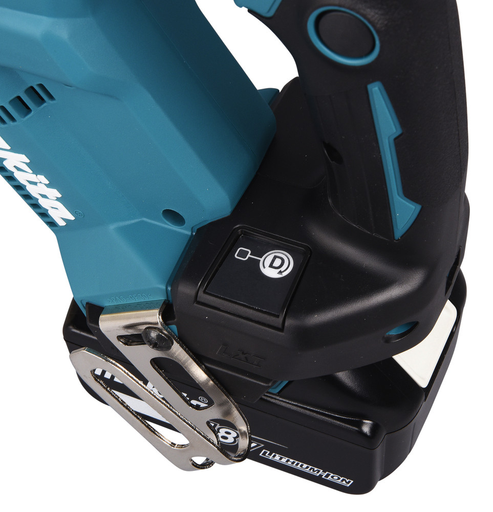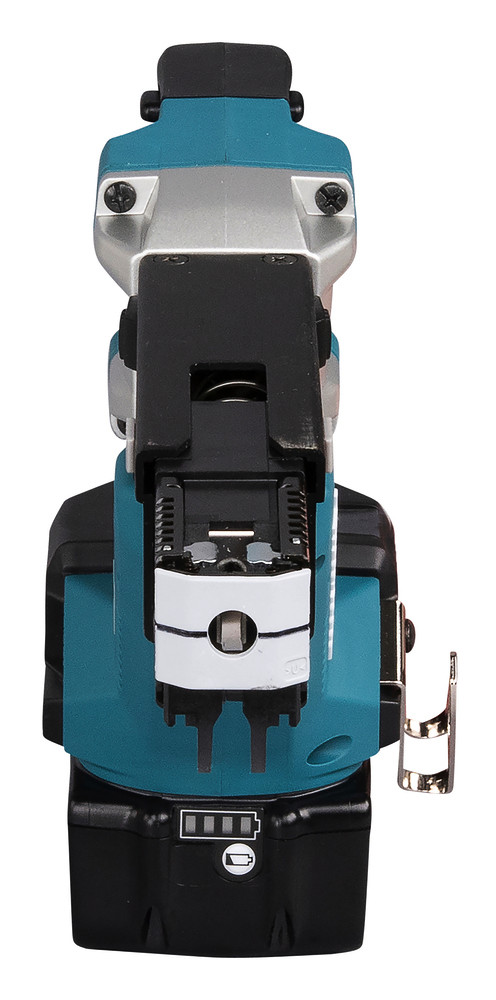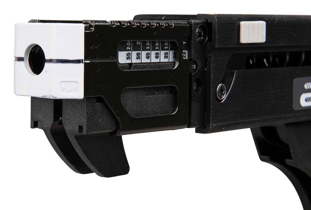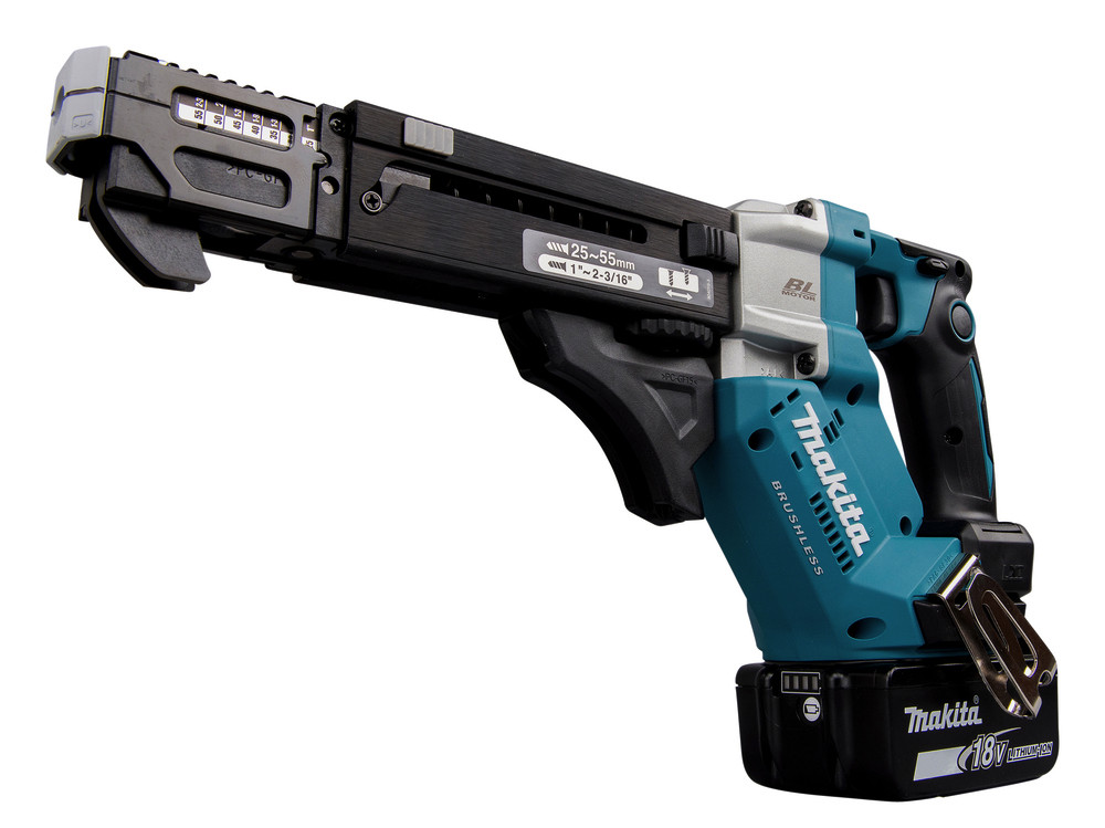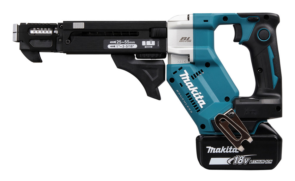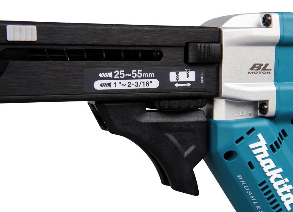 Magazinschrauber mit bürstenlosem Motor und einstellbarer Eintreibtiefe. Mit aktiviertem Push-Drive-Modus startet die Maschine automatisch durch eine Druckausübung auf den Schraubvorsatz. Dadurch wird die Leerlaufzeit miniert und verlängert die Akku-Laufzeit. Die lange Schraubenführung verhindert das Verkanten des Gurtes. Der Akku-Magazinschrauber ist für 25 bis 55 mm Schrauben geeignet.