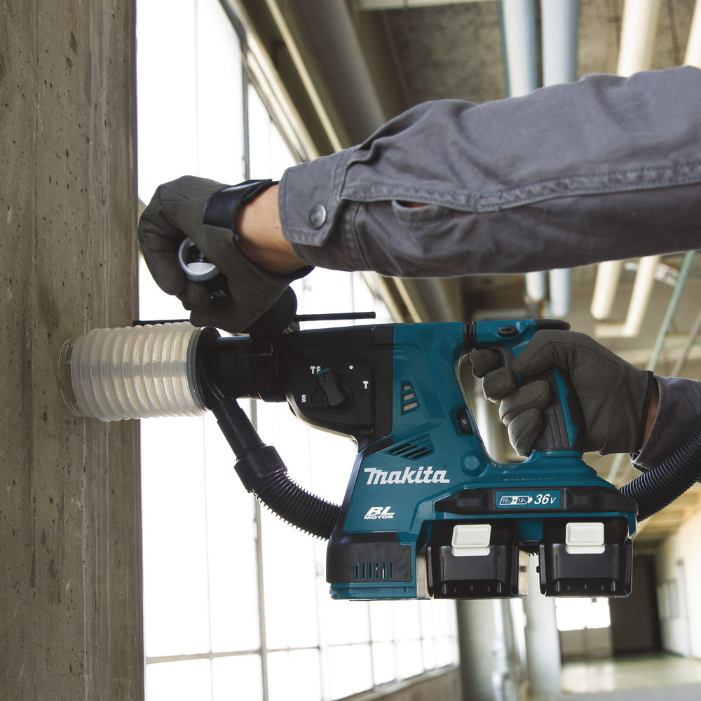 Leistungsstarker Akku-Kombihammer mit SDS-PLUS Aufnahme und einer Rutschkupplung. Der 2 x 18 V Antrieb sorgt für besonders kraftvolles Bohren, Hammerbohren und Meißeln. Die Einzelschlagstärke erreicht bis zu 2,8 Joule, in Beton beträgt die Bohrleistung bis zu 28 mm.