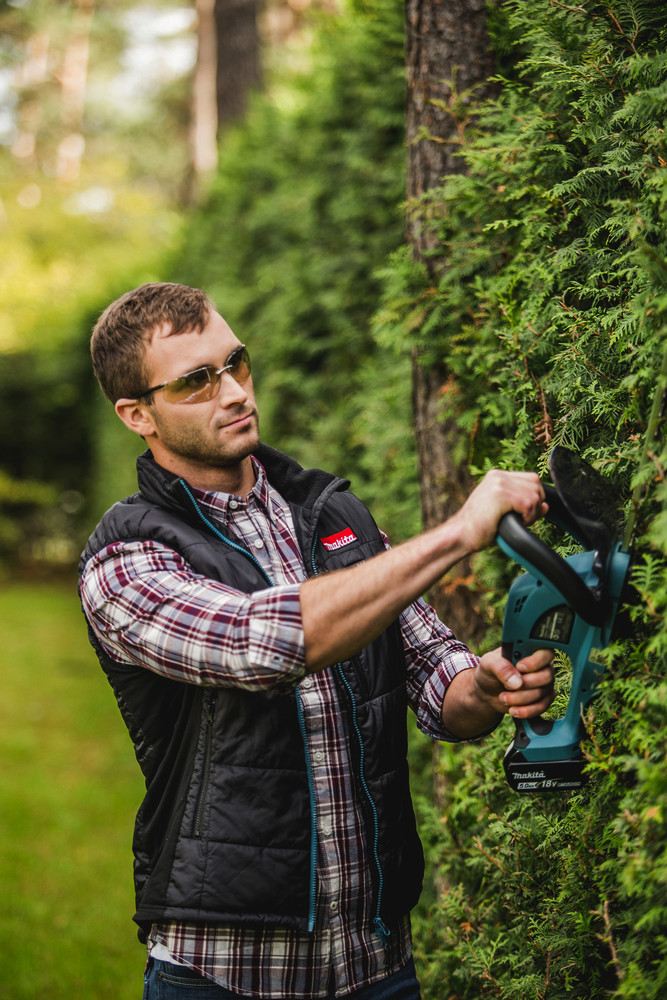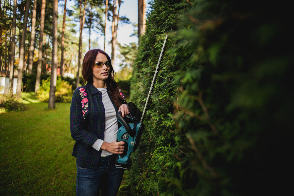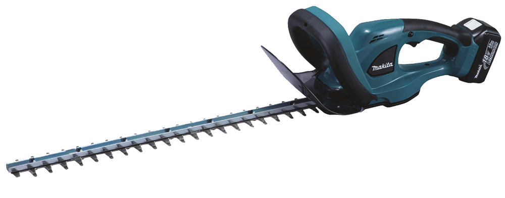 Eine 18 V Akku-Heckenschere mit 52 cm Schnittlänge für den heimischen Garten, Das Gerät hat einen geringen Geräuschpegel und einen vibrationsarmen Handgriff, Ein Sicherheitsschalter verhindert ein unbeabsichtigtes Anlaufen der Maschinen,