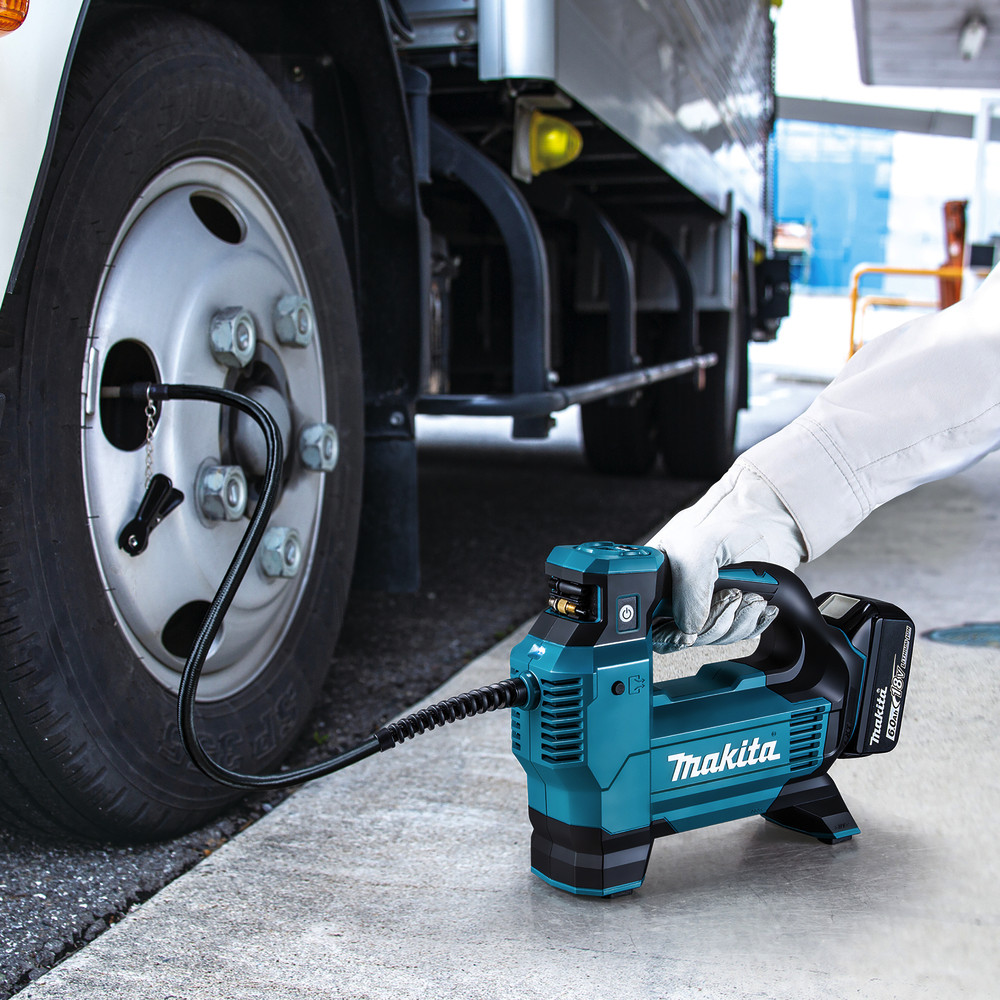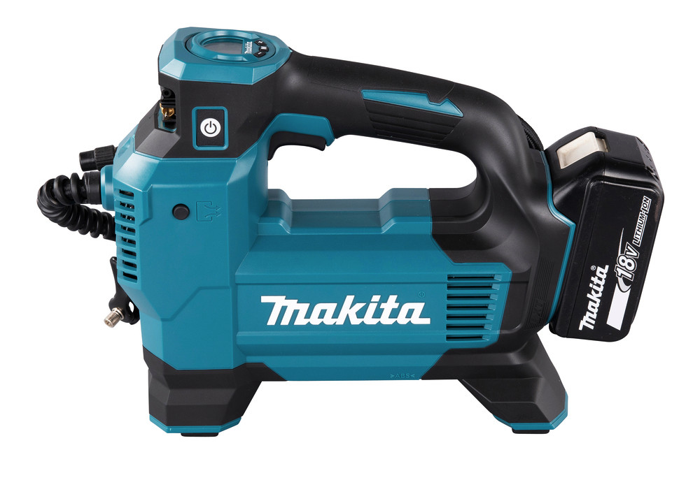 18 V Akku-Kompressor mit +/- Tasten zum exakten Voreinstellen des gewünschten Drucks, das Display zeigt zeitgleich den Ist- und Sollwert. Der Kompressor erreicht einen Druck von bis zu 11,1 bar und verfügt über drei Geschwindigkeitsstufen. Der Schlauch ist 0,65 m lang. Mit eingebauter LED zur Ausleuchtung des Umfelds. Inkl. diversen Ventiladaptern.