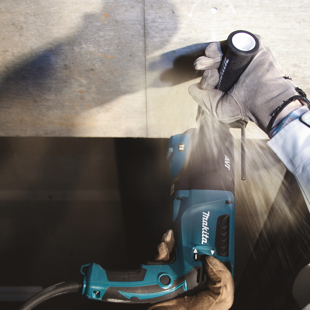 Ein leistungsfähiger Kombihammer mit Anti-Vibrations-Technologie AVT für SDS-PLUS Einsteckwerkzeuge, Geeignet zum Bohren, Hammerbohren und Meißeln, Motorleistung 800 W, Drehzahl kann zwischen 0 und 1,200 min-1 mittels Schalter eingestellt werden, Einzelschlagstärke: 2,4 J, optimaler Bohrbereich: 8-18 mm in Beton, max, Bohrleistung 26 mm,