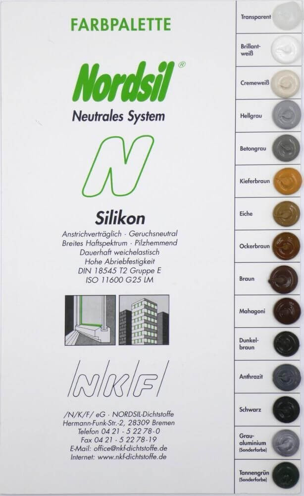 Dieser neutralvernetzende Silikondichtstoff ist einkomponentig und speziell für Anschluss- und andere Bewegungsfugen im Innen- und Außenbereich geeignet. Das Silikon ist unverschnitten und enthält keine artfremden Weichmacher. Er erfüllt höchste Anforderungen nach: DIN 52452 T4, Gruppe E DIN 18545 T2, Einsatz in RLT-Anlagen gemäß VDI 6022 1 sowie Lebensmittel be- und verarbeitenden Bereichen, UV- und witterungsbeständig nach ISO 11600 25 LM. Temperaturbeständigkeit: von ‑50°C bis +150°C. Zulässige Gesamtverformung: 25 % nach DIN 52455-3. Aushärtezeit: (23°C 50 % rel. LF), 3.0 mm in 24 Stunden, 7.0 mm in 7 Tagen.