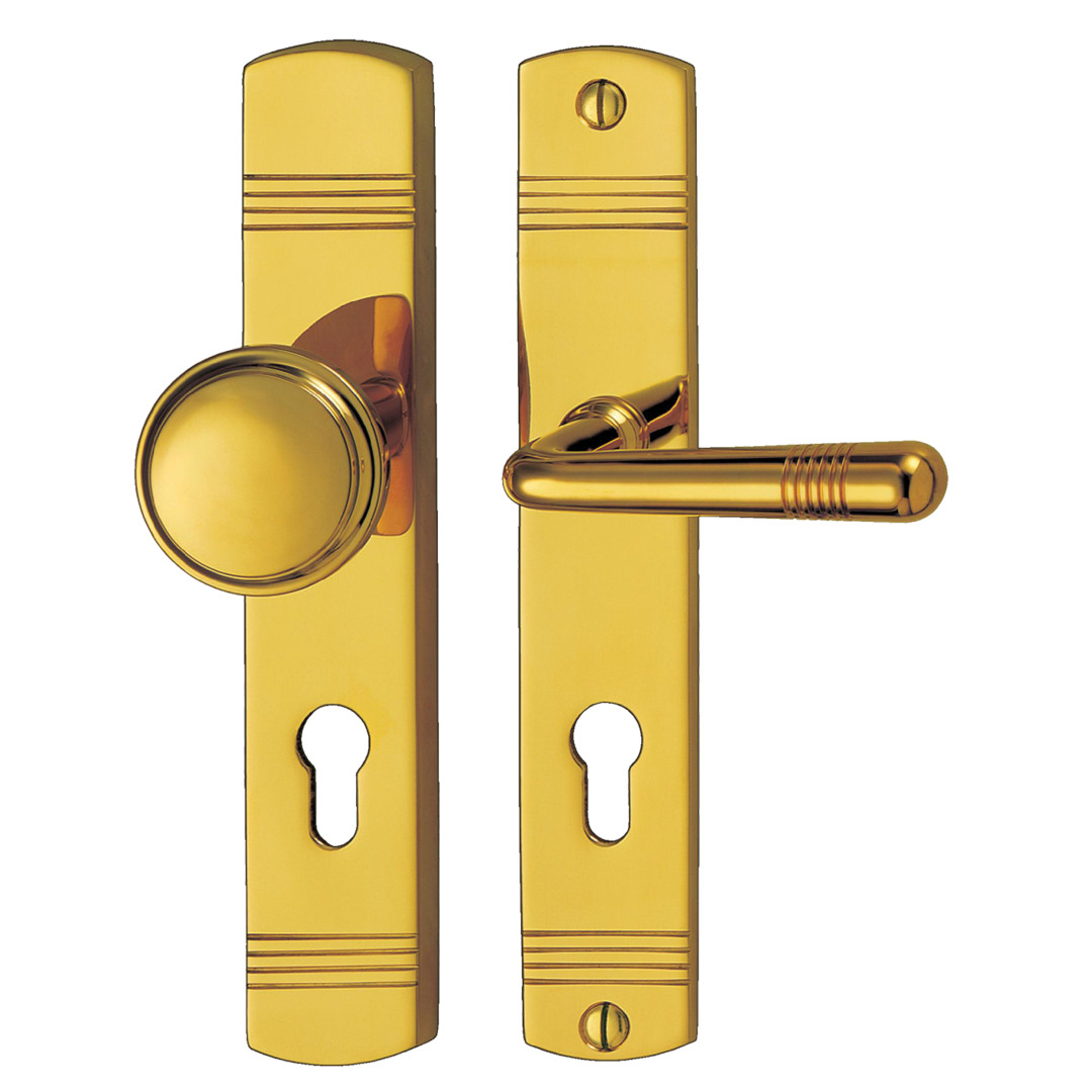 Messing polierte Wechselgarnitur für Haustüren mit Knauf und Innendrücker. Die Wechselgarnitur ist rein Messing poliert ohne Lack.
