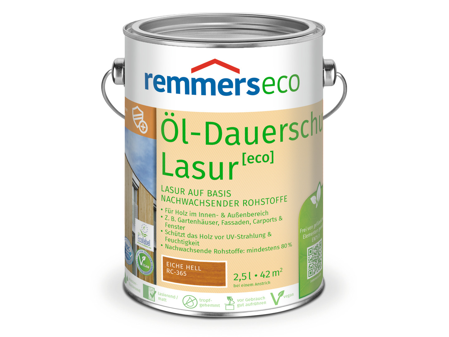 eigenschaften :Wasserbasiert, mit sehr geringem Lösemittelgehalt|Auf Basis erneuerbarer Rohstoffe: mindestens 80 %|Geprüfte Bienenverträglichkeit|Veganes Produkt aufgrund der uns vorliegenden Informationen|Blockfest (gem. Richtlinie HO.03)|Tropfgehemmt|Wetter- und UV-beständig|Guter Verlauf|Elastisch|Atmungsaktiv|Recyclingfähiges Metallgebinde