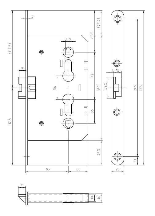 Verzinkter Kasten, Falle und Riegel aus Zink-Druckguss, Nuss 8 mm, Dornmaß 65 mm, Entfernung 72 mm, Stulpmaß 20 x 235 mm, DIN links und DIN rechts verwendbar.