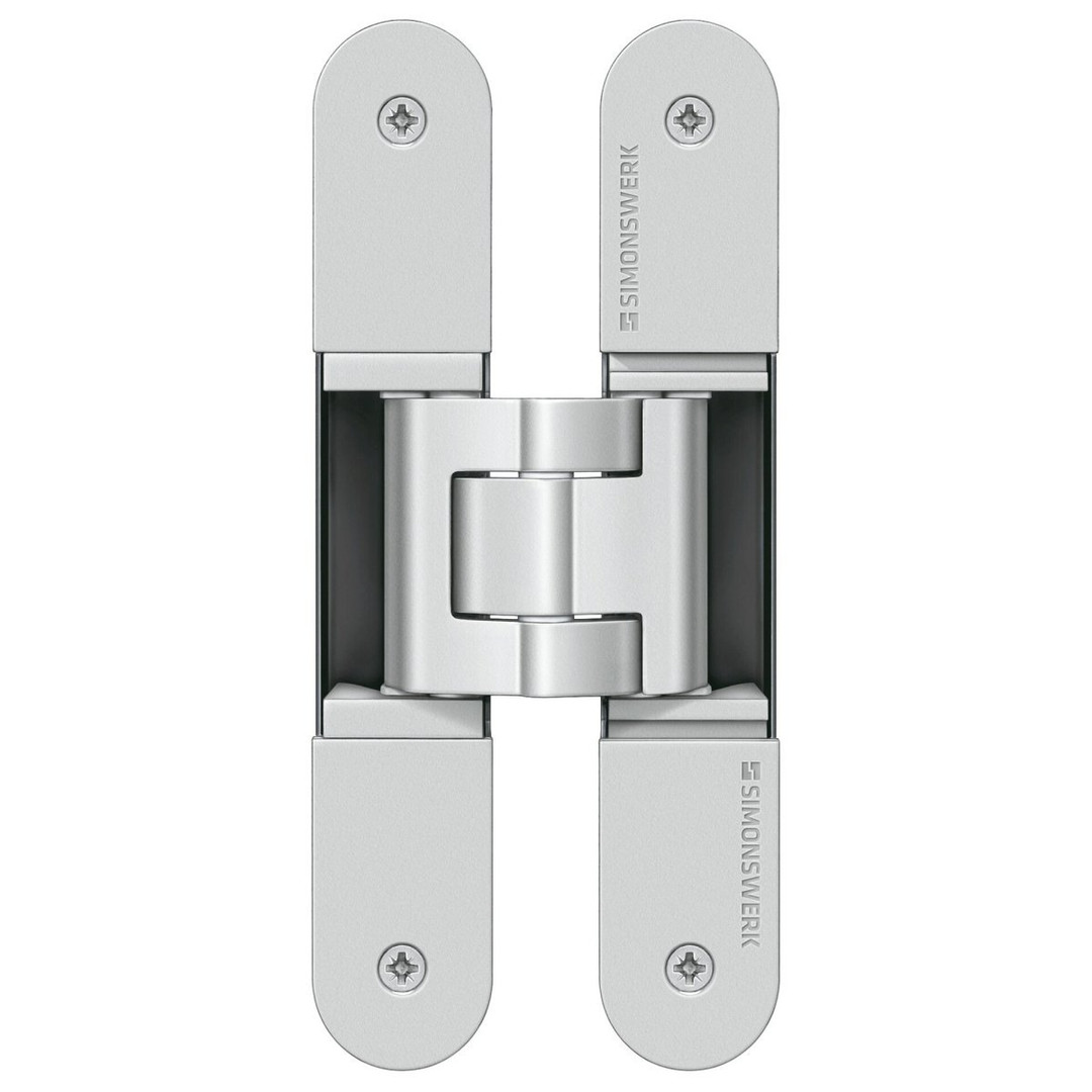SIMONSWERK Türband TECTUS TE 340 3D. Komplett verdeckt liegend für ungefälzte Türen an Holz-, Stahl- und Aluminiumzargen. UL-zertifiziert, mit komfortabler 3D-Verstellung, Belastungswert 80 kg, Öffnungswinkel bis 180°, Gesamtlänge 160 mm, DIN rechts und links verwendbar, wartungsfreie Gleitlagertechnik, dreidimensional verstellbar: Seite +/- 3,0 mm, Höhe+/- 3,0 mm, Andruck +/- 1,0 mm.