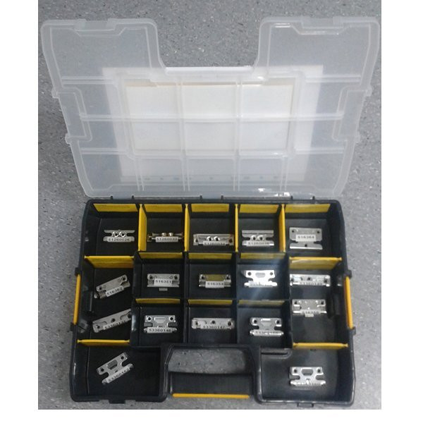 Musterkoffer mit 17 Sorten Pilzkopfschließplatten die wir am Lager führen.