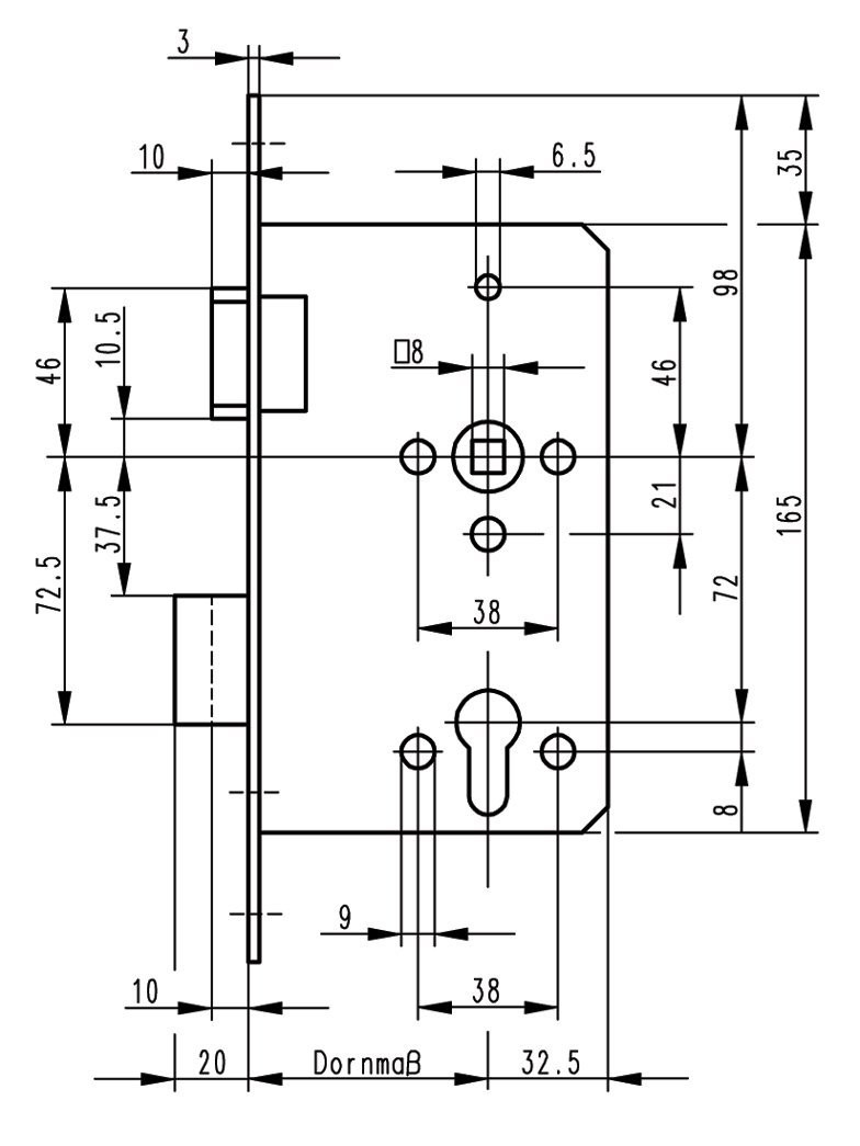 Nach DIN 18251-1 für stumpfe Türblätter, Nuss 8 mm, Entfernung 72 mm, bei BAD 78 mm, Stulpmaß 24 x 235 mm, ohne Schließblech.