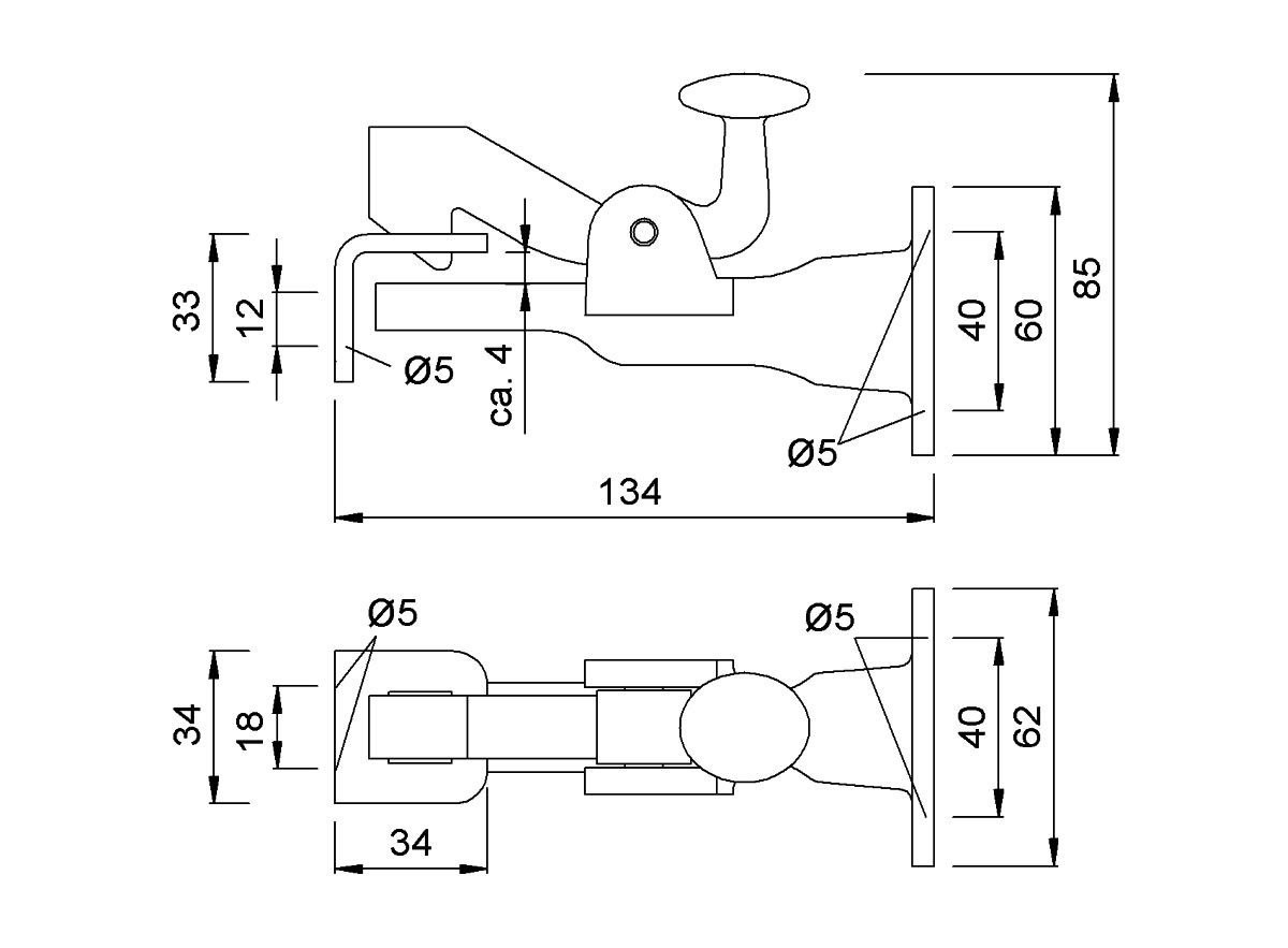 Der Torfeststeller wird am gewünschten Feststellpunkt, der größtmöglichen Abstand zum Torband haben soll, an die Wand geschraubt. An der entsprechenden Stelle wird der Haltewinkel mit 4 mm höhenmäßigem Abstand zur Anschlagplatte des Feststellers so am Tor befestigt, dass sich die Schraublöcher unter dem Fangloch befinden. Beim Feststellen des Tors dient dadurch der Haltewinkel auch als Anschlagfläche.